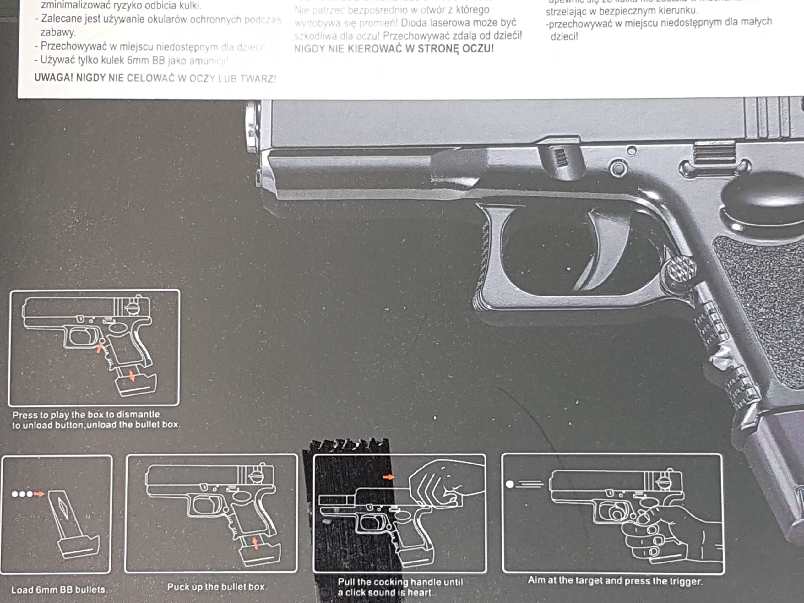 Пистолет ASG 6мм - однозарядная пружинная модель с питанием от рядного магазинного держателя примерно 10 ББ, т.е. после каждого выстрела перезаряжать ружье, отведя затвор назад. Конструкция практически полностью изготовлена из сплава цинка и алюминия (замок, корпус), а также из прочного АБС-пластика - частично магазин, накладки рукоятки и некоторые элементы конструкции механизма. . В комплект входит стартовый набор шариков диаметром 6 мм (около 50 шт.). G19 Galaxy – самая часто покупаемая реплика этого производителя.