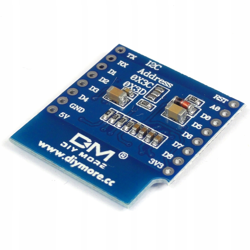 Shield OLED с дисплеем 0,66 дюйма и разрешением 64x48 пикселей, совместимый с модулями беспроводной связи Wemos D1 mini. Связь с ESP8266 осуществляется по шине I2C, что позволяет управлять дисплеем через 2 контакта.