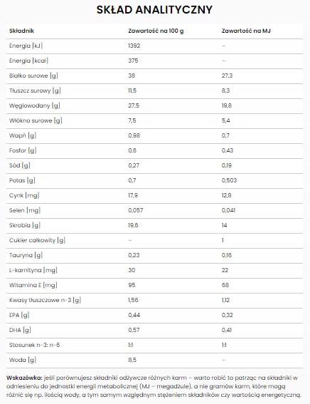 Состав: Свежая рыба, овсяная мука, гороховый крахмал, гидролизованный белок лосося, кукурузный белок, картофельный белок, чечевица, свекольный жом, рыбная мука, свиной жир, гороховая клетчатка, рыбий жир, антарктический криль, гидролизованный белок животного происхождения, яичный порошок, витамины и микроэлементы (в том числе хелатные микроэлементы), мука из водорослей, фруктоолигосахариды, оболочка подорожника, таурин, дрожжи (источник β-1,3/1,6-глюканов), метионин, L-карнитин, зелень экстракт чая, экстракт граната, экстракт клюквы.