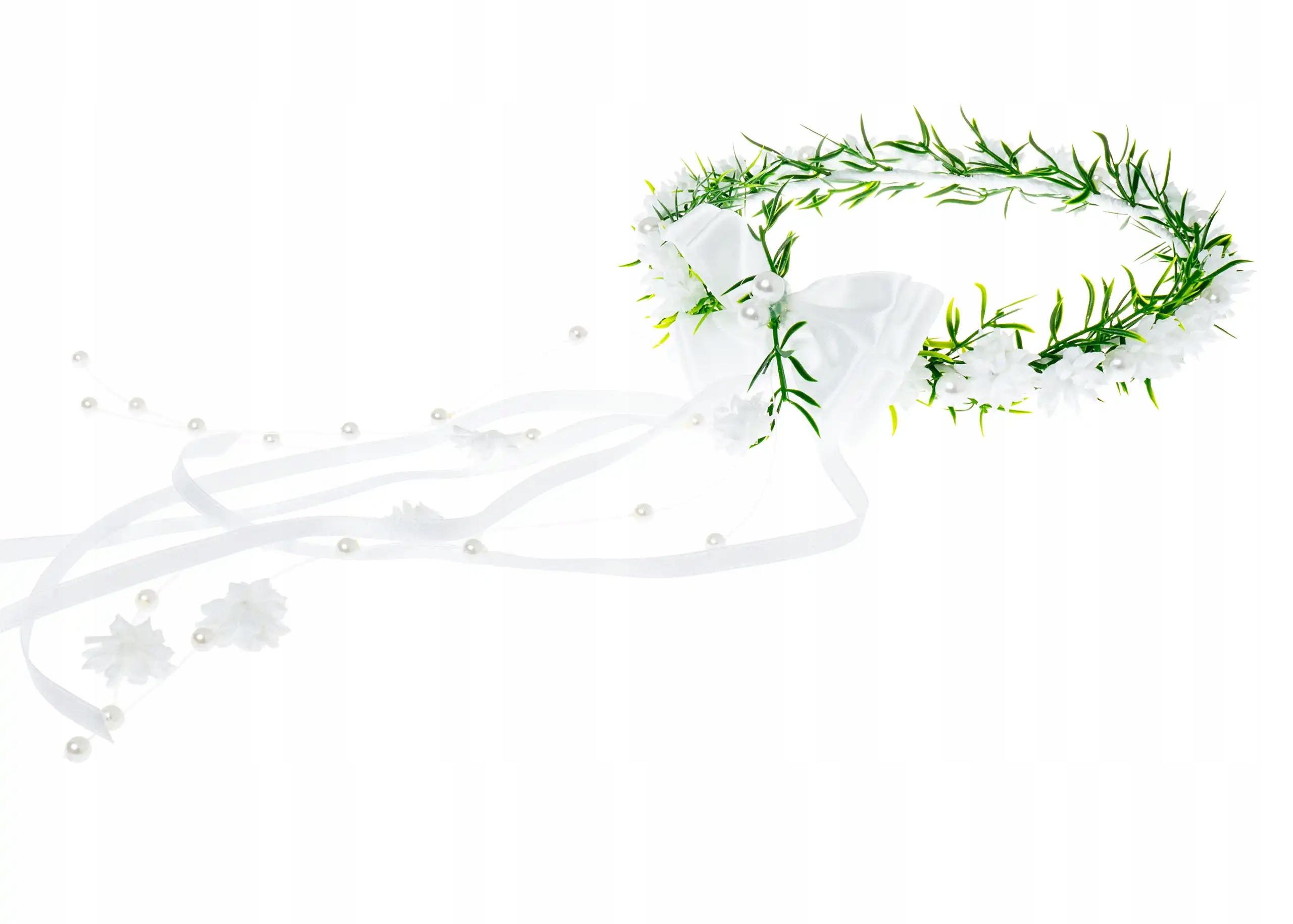 Wianek komunijny z sztucznych białych kwiatów perłami i długą białą wstążką
