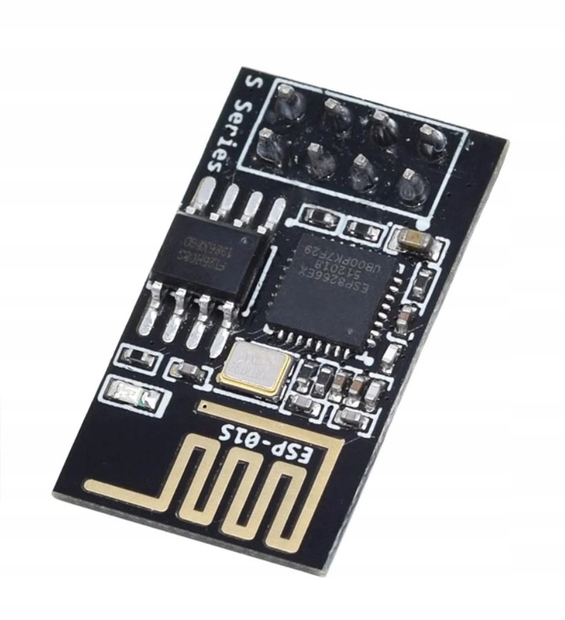 ESP-01S WiFi-модуль, построенный на чипе ESP8266 с флэш-памятью 8 МБ Память . Он работает в стандарте Wi-Fi 802.11 b/g/n на частоте 2,4 ГГц. Он оснащен 8 контактами, 3 из которых GPIO. Встроенная антенна на печатной плате.