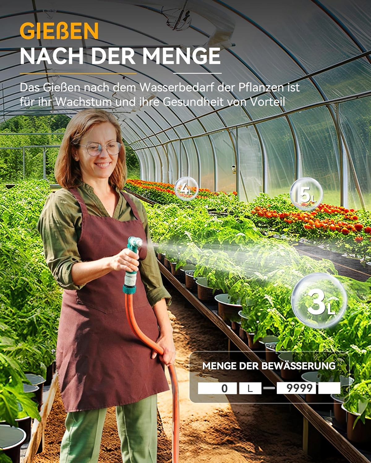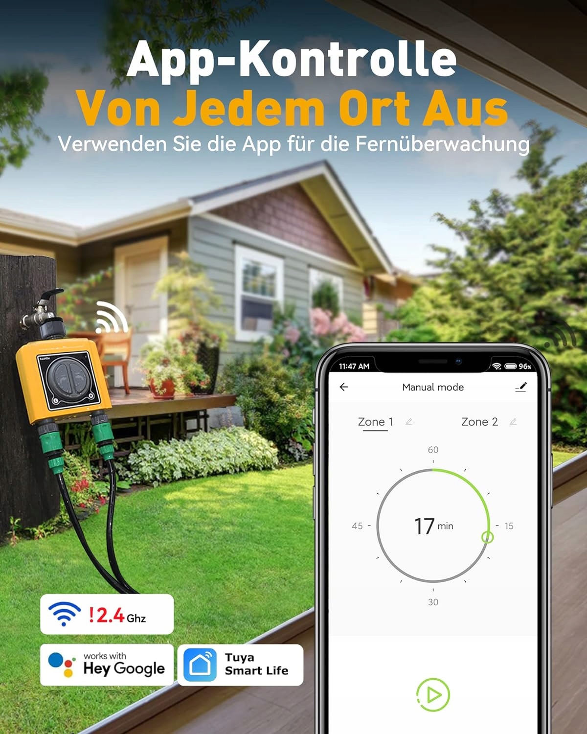 - 【2 индивидуальных и гибких программирования】Поилка с таймером WiFi оснащена 2 независимыми ирригационными клапанами, каждый из которых можно индивидуально запрограммировать на 3 различных плана полива. Это позволяет адаптировать соответствующий график полива к различным участкам, например, к газону и цветочным клумбам. Подходит для всех распространенных шланговых и распределительных систем.