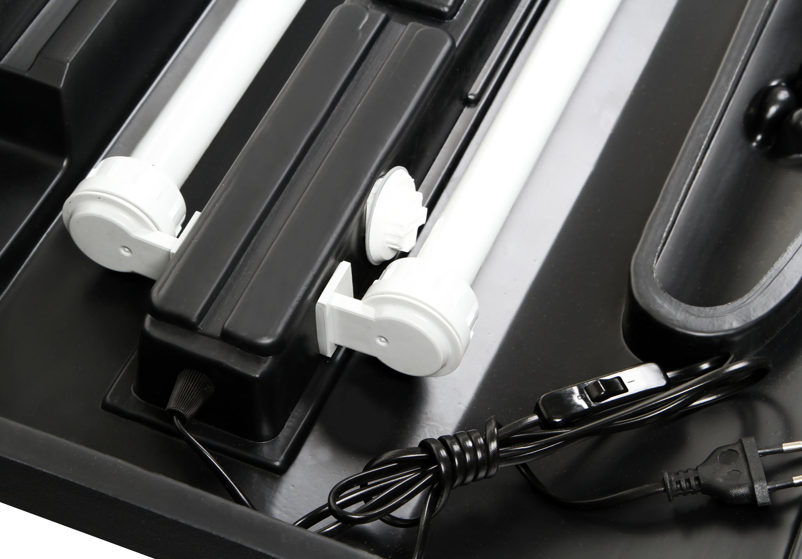 В комплект входит осветительная крышка с 2 люминесцентными лампами мощностью 18 Вт. Все упаковано производителем, ни разу не использовалось. В крышке имеется выход для кабеля, что облегчает монтаж устройств внутри аквариума. Возможность подключения внешнего фильтра!