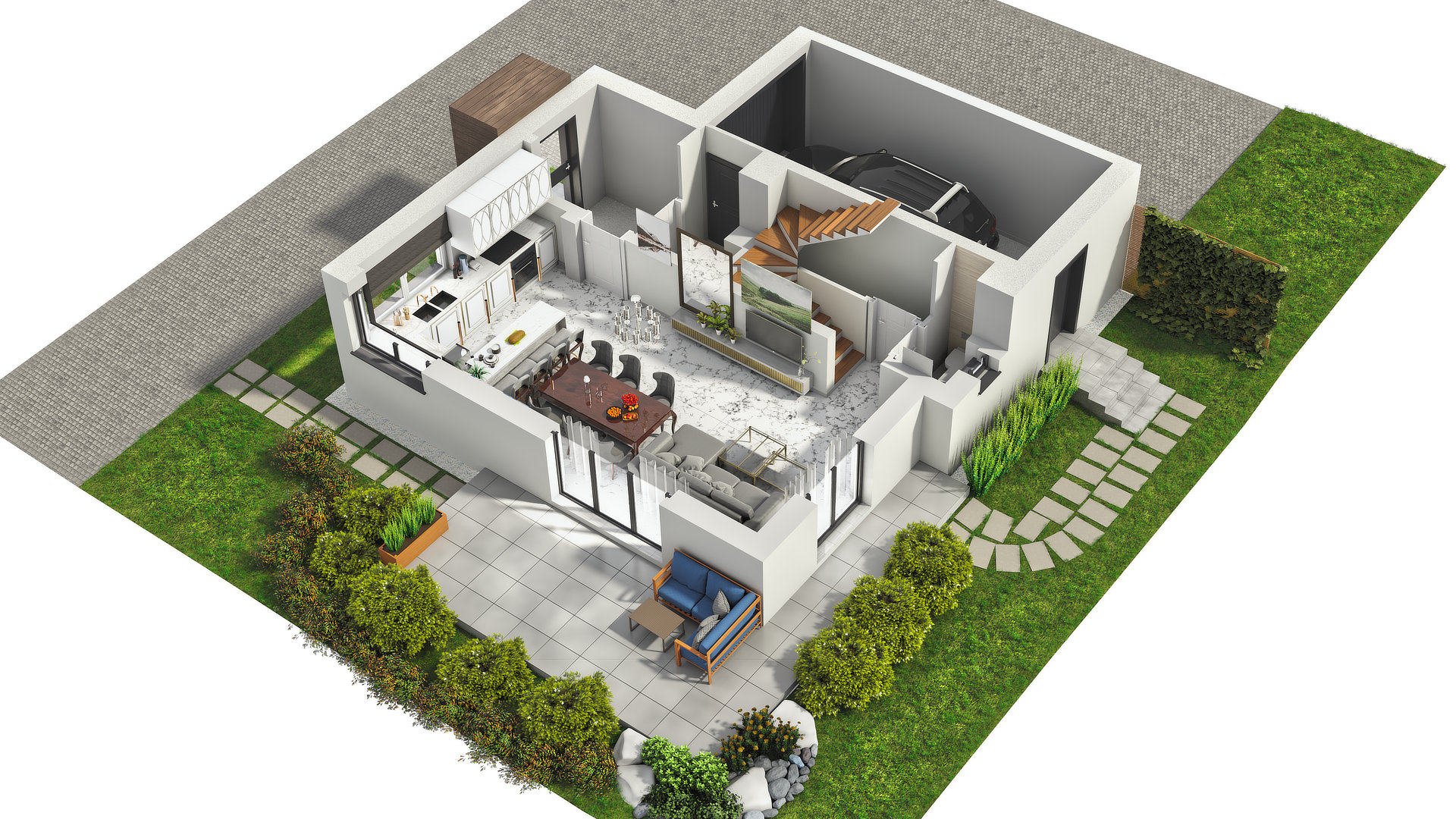 Этот тип 3D-плана идеально представляет всю композицию. 3D-визуализации часто используются дизайнерами интерьеров и продавцами дизайна домов. На 3D-плане наглядно показано расположение мебели в комнате. Трехмерная проекция, современная, разборчивая и красивая.