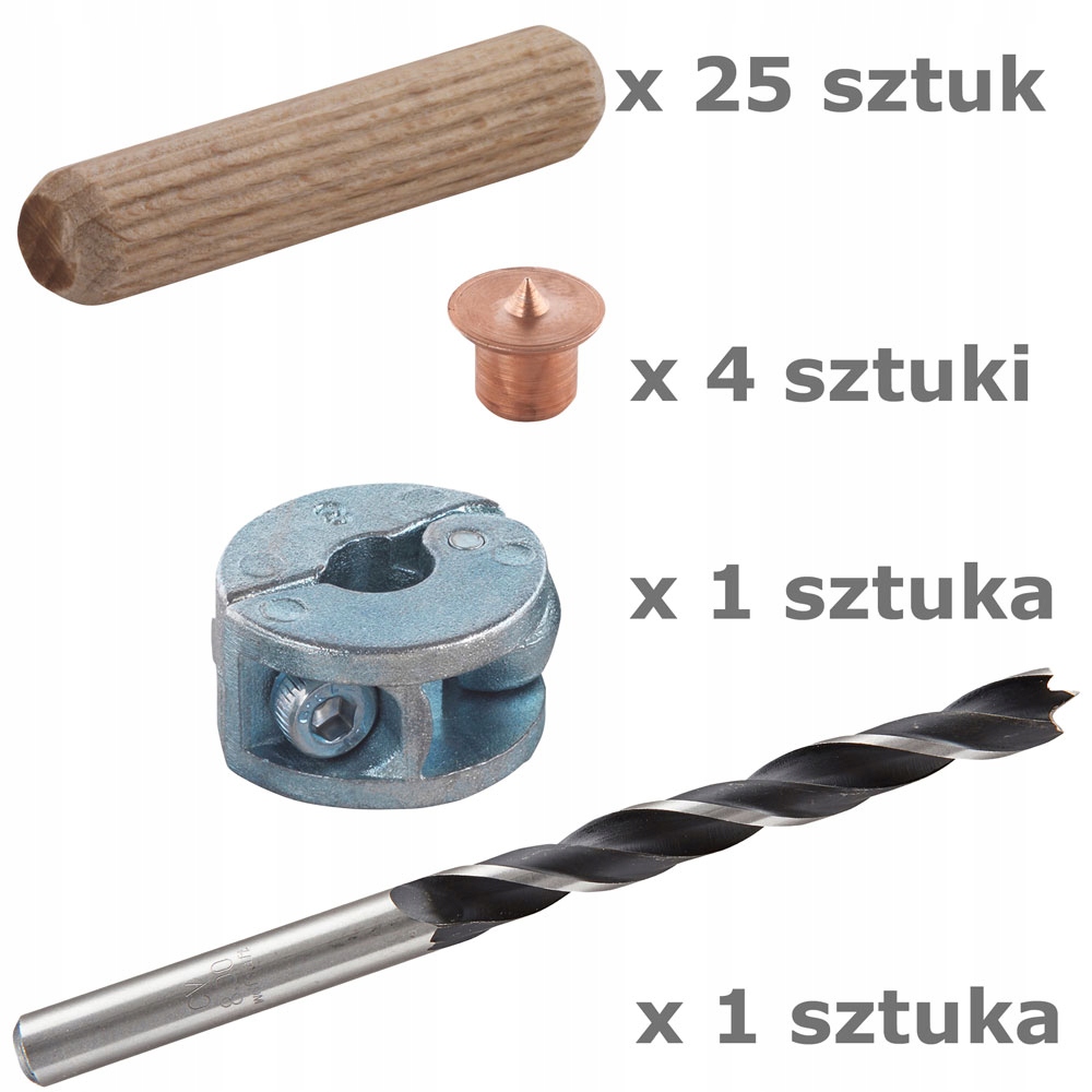 Супернабор инструментов Wolfcraft для дюбельных соединений - инструмент для столярных дюбельных соединений, в комплекте с набором из 25 штук дюбелей диаметром 8 мм, сверлом по дереву 8 мм, ограничителем глубины сверления. и набор из 4 штук маркеров по 8 мм.