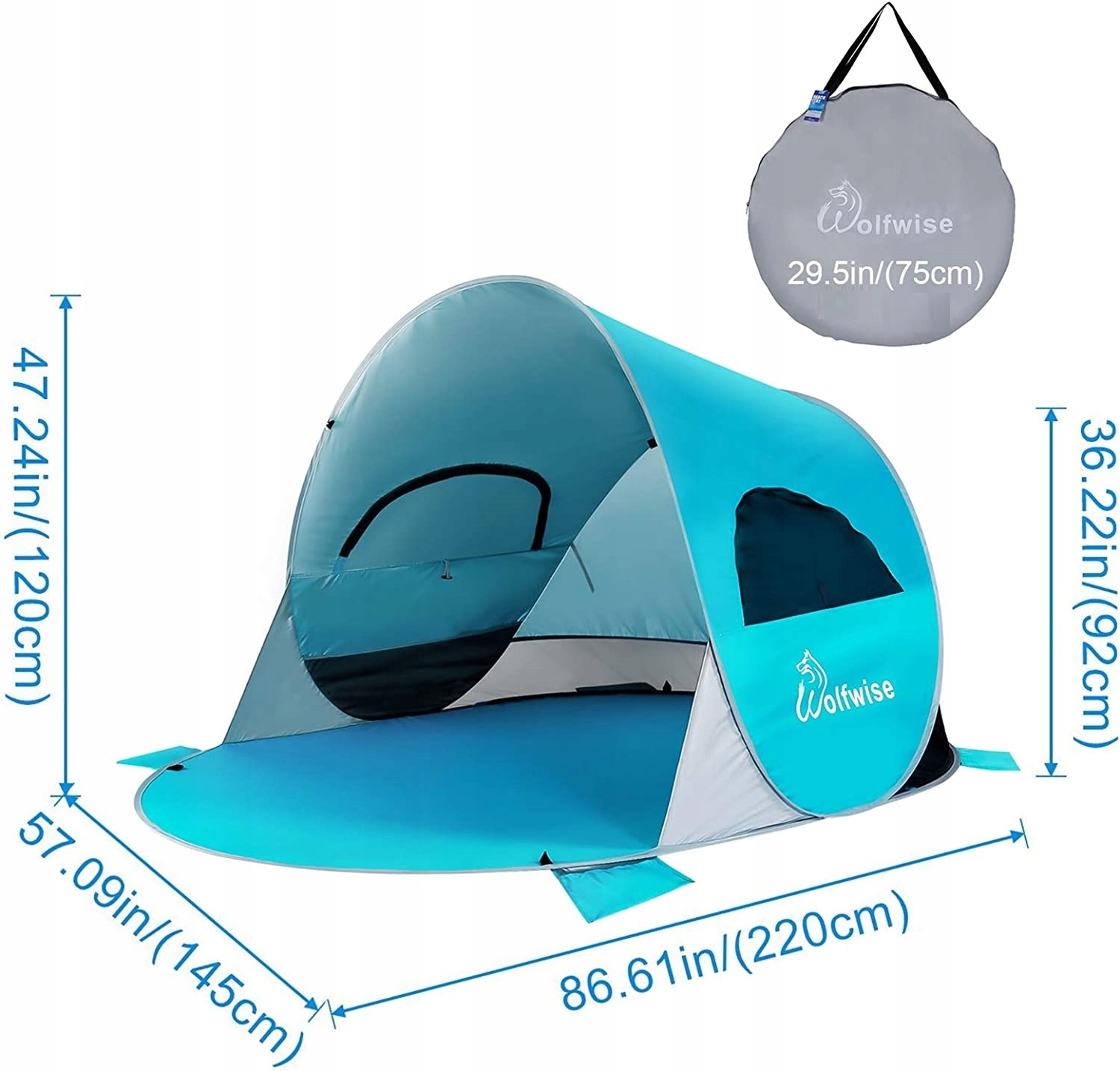 WOLFWISE Large Beach Tent Self-solding Popup 3-4 person UPF 50+ UV