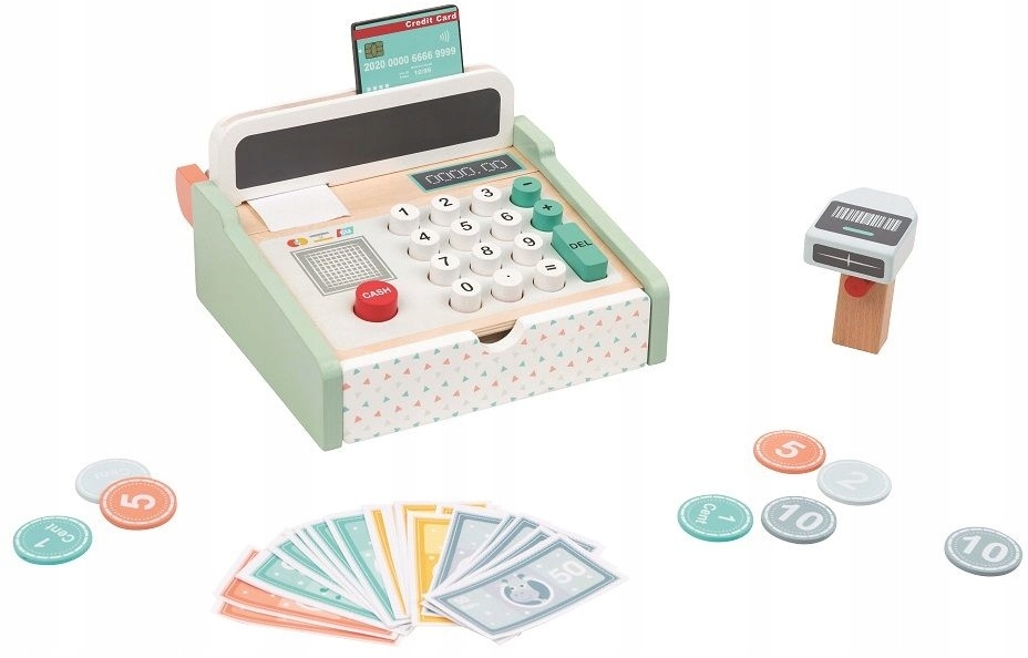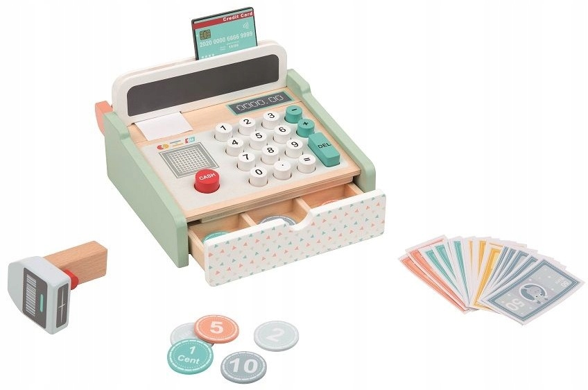 Кассовый аппарат полностью изготовлен из дерева, за исключением рулона бумаги, используемого для «распечатать» квитанции и бумажные банкноты. Кассовый аппарат имеет цифровую клавиатуру, помимо кнопок «-», «+», «=", «DEL» и «НАЛИЧНЫЕ». Кассовый аппарат имеет выдвижной ящик с отделениями для купюр и монет.