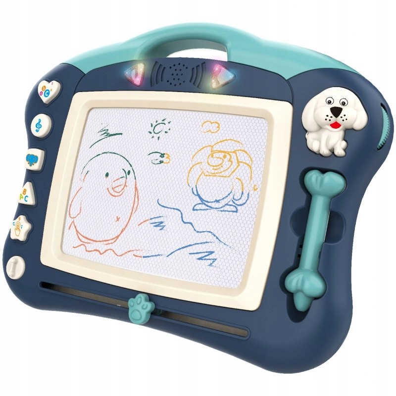 Магнитная доска Znikopis дает вам возможность долгое время заниматься творчеством! Доска поощряет писать и рисовать. Рисование поможет сконцентрироваться, успокоиться и успокоить ребенка. Альбом позволяет создавать бесконечное количество картинок – просто переместите специальный ползунок, и рисунок исчезнет, ​​и вы сможете рисовать снова! В набор также входит удобная волшебная ручка. Кроме того, 5 многофункциональных кнопок: песня, мелодия, животное, буква и кнопка преобразования. При издании звуков доска загорается, привлекая внимание ребенка. Доска имеет удобную ручку, благодаря которой ребенок может брать ее куда угодно, и имеет возможность удлинять ножки, что облегчает ребенку письмо за столом. Описание будет развивать у ребенка мануальные навыки, воображение, творческие способности и поможет в развитии художественной стороны ребенка!