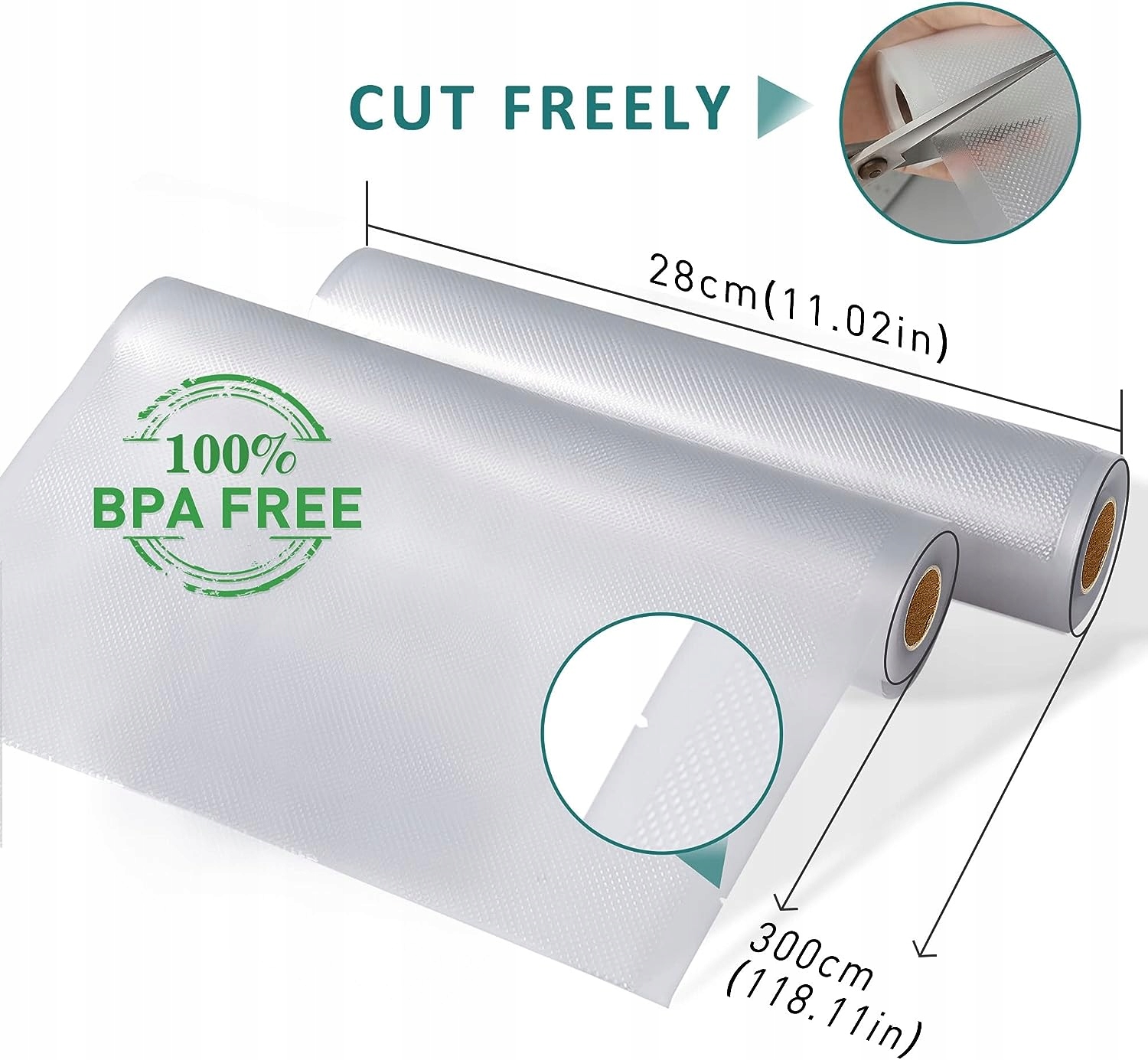 Размеры: 28 см x 300 см, количество: 5 рулонов Передняя панель толщиной 3,55 мил. Задняя панель — текстурированная, тисненая, 4 мил, пищевой материал, не содержит BPA. По сравнению с обычным хранением продукты могут оставаться свежими дольше.