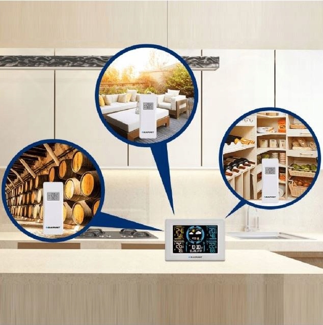 Blaupunkt Метеостанция WS40WH имеет встроенный датчик для измерения температуры и влажности внутри помещения, где она применяется. Три дополнительных беспроводных датчика с ЖК-дисплеями, входящие в комплект, позволяют проводить измерения на открытом воздухе или в любом выбранном месте. Данные измерений температуры и влажности постоянно обновляются и отображаются на ЖК-дисплее, встроенном в метеостанцию*. Дополнительно устройство имеет память для измерения самых низких и самых высоких значений как температуры, так и влажности, которая автоматически обнуляется в начале следующего дня. Значения температуры могут отображаться как в градусах Цельсия, так и в градусах Фаренгейта.