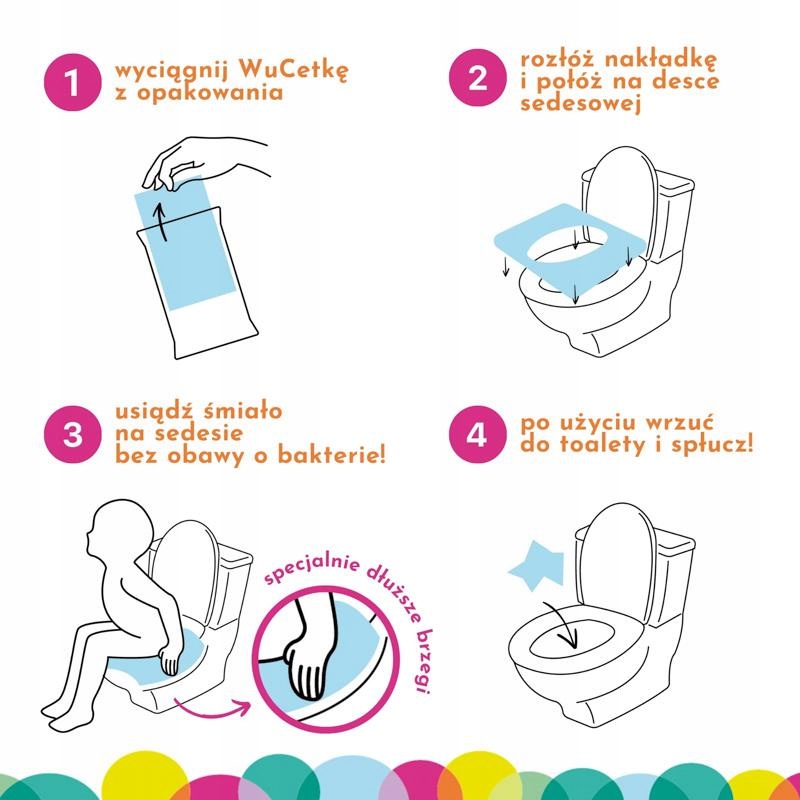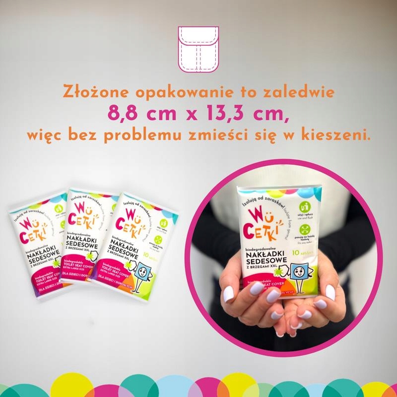 Вам больше не придется беспокоиться о том, чтобы сходить в туалет за пределами дома. Благодаря бумажным одноразовым крышкам для унитаза вы не только сможете безопасно пользоваться любым туалетом, но и обеспечите себе комфорт и правильную осанку. Чехлы обеспечивают гигиеничное и комфортное пользование унитазом и предотвращают прямой контакт кожи с поверхностью сиденья унитаза. Их несомненный плюс в том, что они просты в использовании и биоразлагаемы: надеваешь, снимаешь и выбрасываешь в мусор или смываешь в унитаз. Поскольку края WuCetki немного длиннее, они идеально подходят для детей, которые касаются краев унитаза во время пользования туалетом. Упаковка WuCetek небольшая, поэтому ее можно легко поместить в карман брюк или положить в любую сумочку или рюкзак.