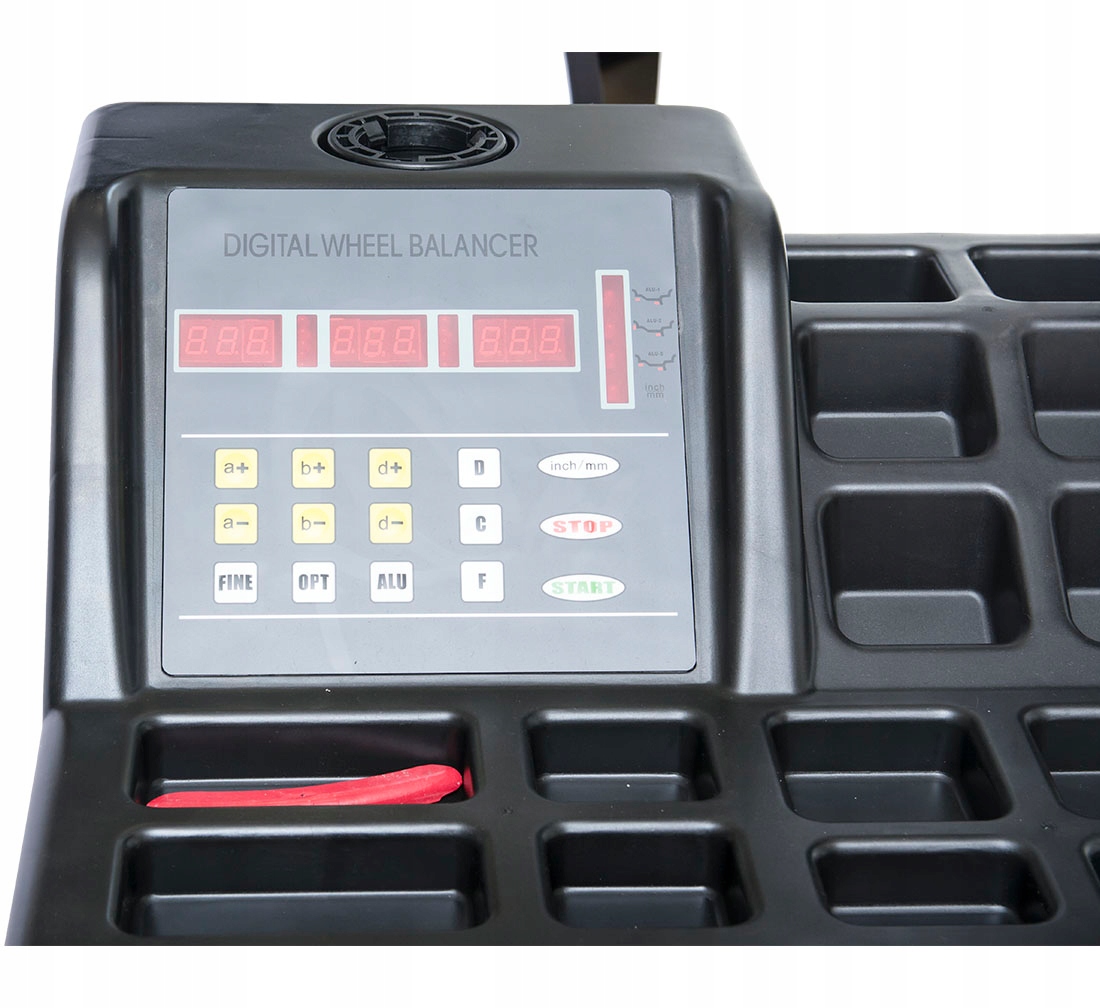 Балансировщик имеет интуитивно понятную панель управления со светодиодными дисплеями, эксплуатация которой уже не вызывает затруднений после двух использований. Прибор автоматически укажет место разбалансировки колес благодаря позиционеру дисбаланса в виде электромеханического тормоза, звуковому сигналу и диодам на дисплее.