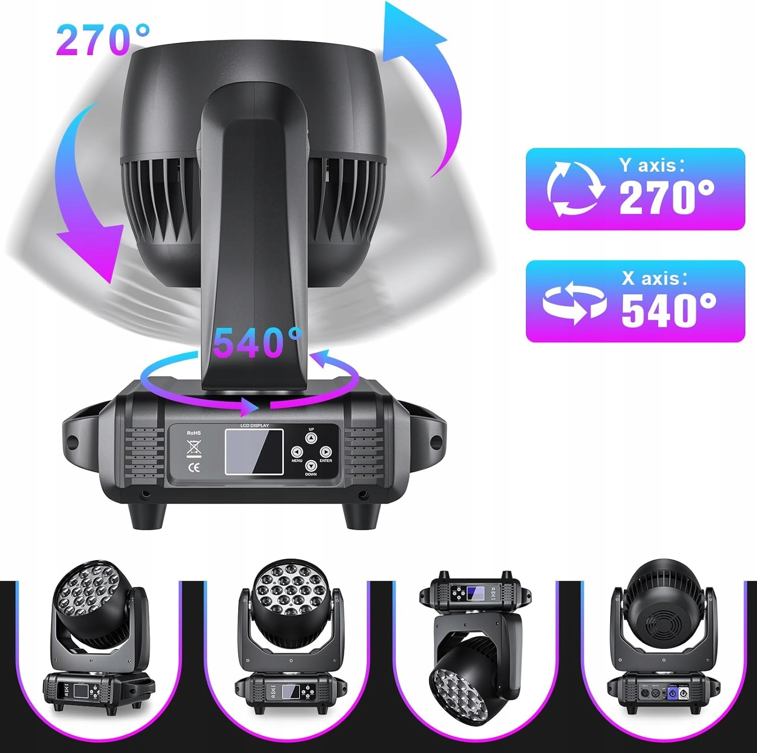 wzabuta 15 w h1> подвижная головка RGBW h1> светодиодное мытье луча DMX h1> Стадия эффекта мыть и может отображать эффект HD. Поворот на уровне оси x составляет 540 градусов, а вращение оси Y составляет 270 ° с автоматической коррекцией позиционирования. Изменение цвета и затемнение с линейной регулировкой 0-100%. Угол масштабирования составляет 8 - 55 градусов, угол освещения 15 градусов.