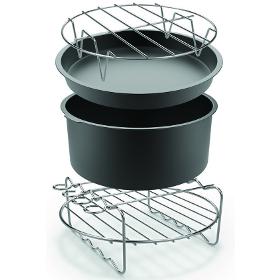 Аксессуары для Tefal XA113010 Easy Fry XXL 20 см состоит из формы для пирога, сковороды для пиццы, игл гриля и металлической стойки. Совместим с Tefal EY70/ EY80/ FW20/ FW50 бесплатно.