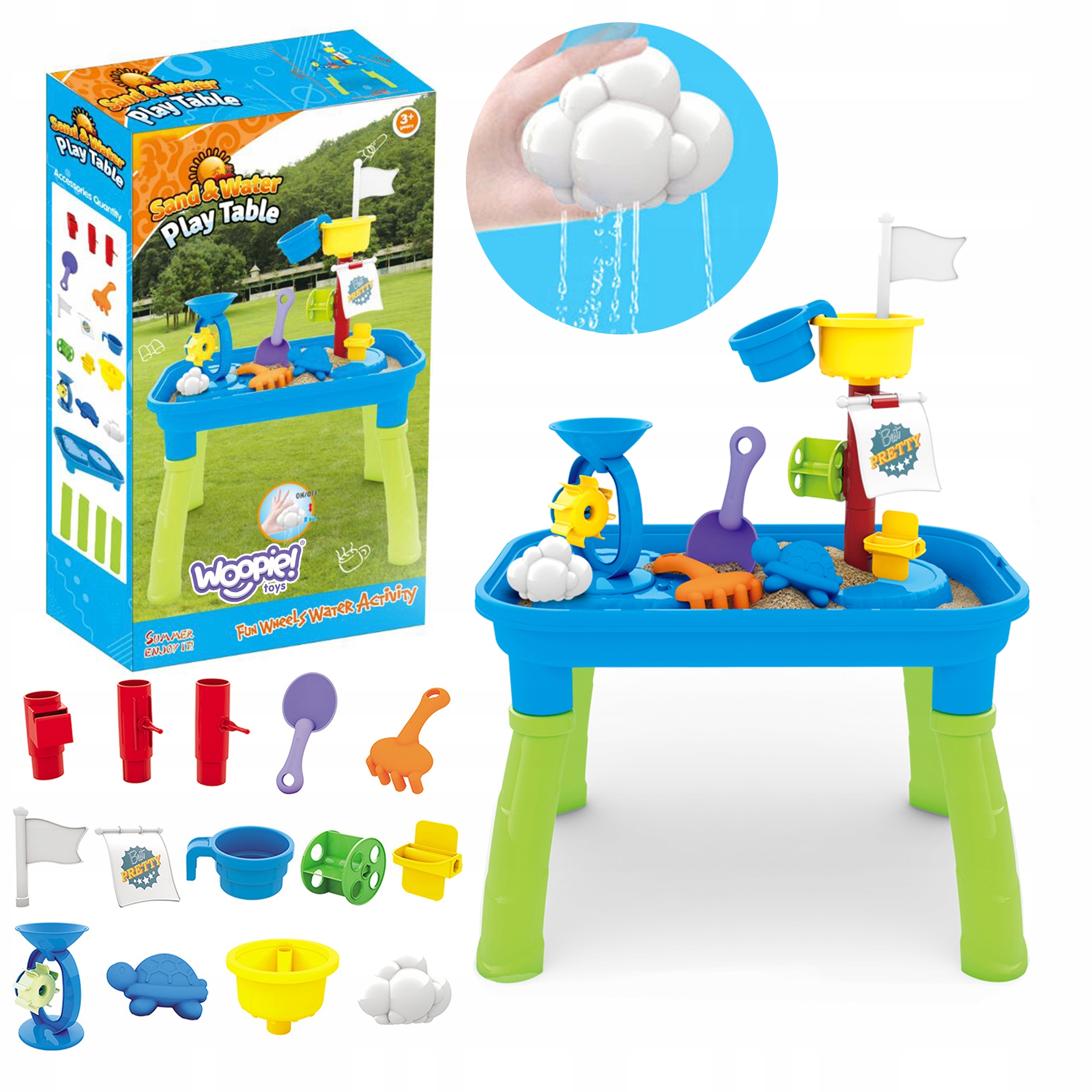 Песочный стол – идеальная игрушка для игр с водой и песок. В наборе множество аксессуаров для игры, в том числе формочки, грабли, лопатка и многое другое. С помощью чашки ребенок может вылить воду на мачту и увидеть, как вода движется через водяные мельницы. Стол предназначен для игры дома и на улице. Идеально подходит для игр дома, на пляже или в песочнице.