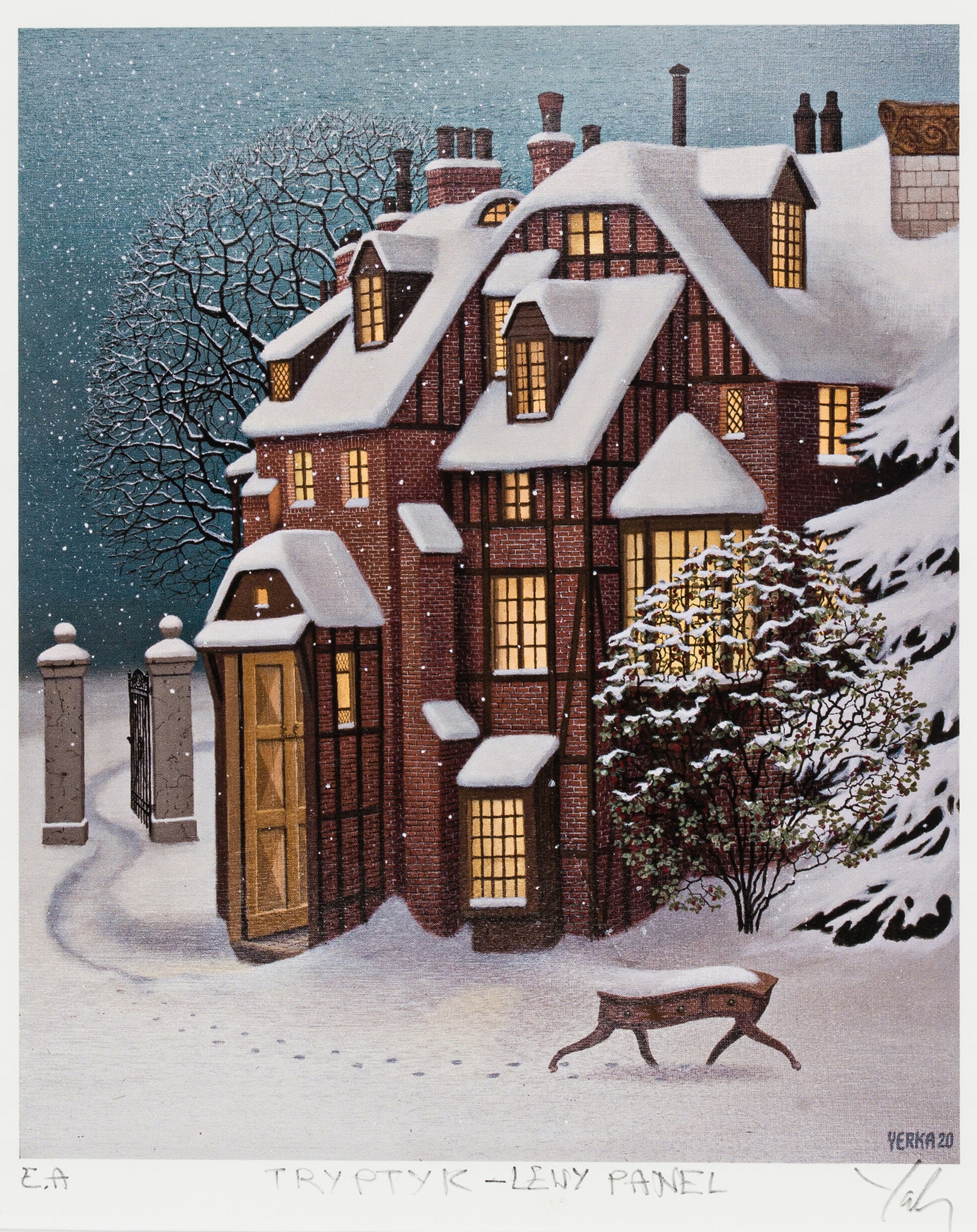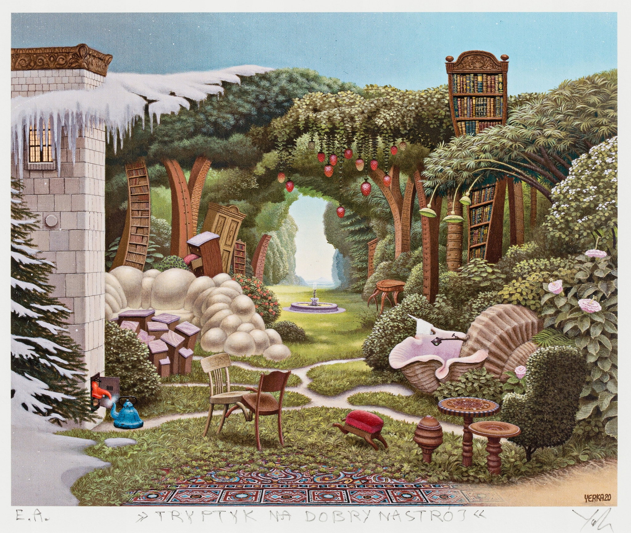 Аутентичная работа известного современного художника Яцека Йерки, представляющая собой триптих с сюрреалистическими композициями. В трёх небольших сценках автор представил три разных пространства, создав сказочную историю о смене времен года. В первом квартале слева в зимнем ночном пейзаже виден высокий старый дом. Здание покрыто слоем снега, а из окон светит теплый свет, контрастирующий с прохладным голубоватым фоном и голыми ветвями деревьев. У подножия дома видна небольшая фантастическая фигура. В центральной части изображен фантастический сад – полный зелени, кустов и деревьев, среди которых спрятана мебель, книги и странные предметы, словно принадлежащие миру грез. Это пространство создает впечатление волшебной, упорядоченной случайности, а центральная аллея уводит взгляд вглубь композиции, к яркому свету вдали. Последний квартал представляет собой экзотический пляж с золотым песком и бирюзовой водой. Стройные, высокие деревья растут прямо у береговой линии, а огромное оранжевое солнце поднимается над горизонтом, напоминая закат в приморском пейзаже. Изображенные сцены излучают умиротворение. Весь триптих выполнен в стиле магического реализма, сочетающего элементы реальности с фантазией.
