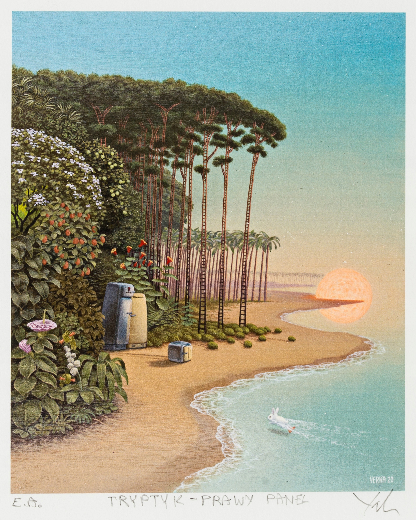 Яцек Йерка (род. 1952) один из самых узнаваемых польских современных художников. В 1976 году окончил факультет изящных искусств Университета Николая Коперника в Торуни. Он специализировался на графике. В первые годы после окончания университета выставлял плакаты, в том числе: на биеннале польского плаката в Катовице в 1977 и 1979 годах, международных биеннале в Лахти и Варшаве и других. С 1980 года он полностью посвятил себя живописи. Основываясь на точных техниках изображения по образцу старых мастеров (Ян ван Эйк, Иероним Босх), но прежде всего на собственном безграничном воображении, он создает сюрреалистические композиции, особенно восхищающиеся любителями фэнтези во всех ее проявлениях. Например, оно вдохновило автора фэнтези Харлана Эллисона на написание 30 рассказов, которые вместе с картинами Йерки составили издание под названием «Поля разума». То же американское издательство «Morpheus International» выпустило альбом «The Fantastic Art of Jacek Yerka». В 1995 году художник получил престижную премию World Fantasy Award как лучший художник. Выставляется в Польше и за рубежом (в Германии, Франции, США и др.), являясь ценным представителем направления фэнтези-арта. Он участвовал в создании американского фильма «Земляничные поля», где изображения должны были сопровождаться музыкой «Битлз».