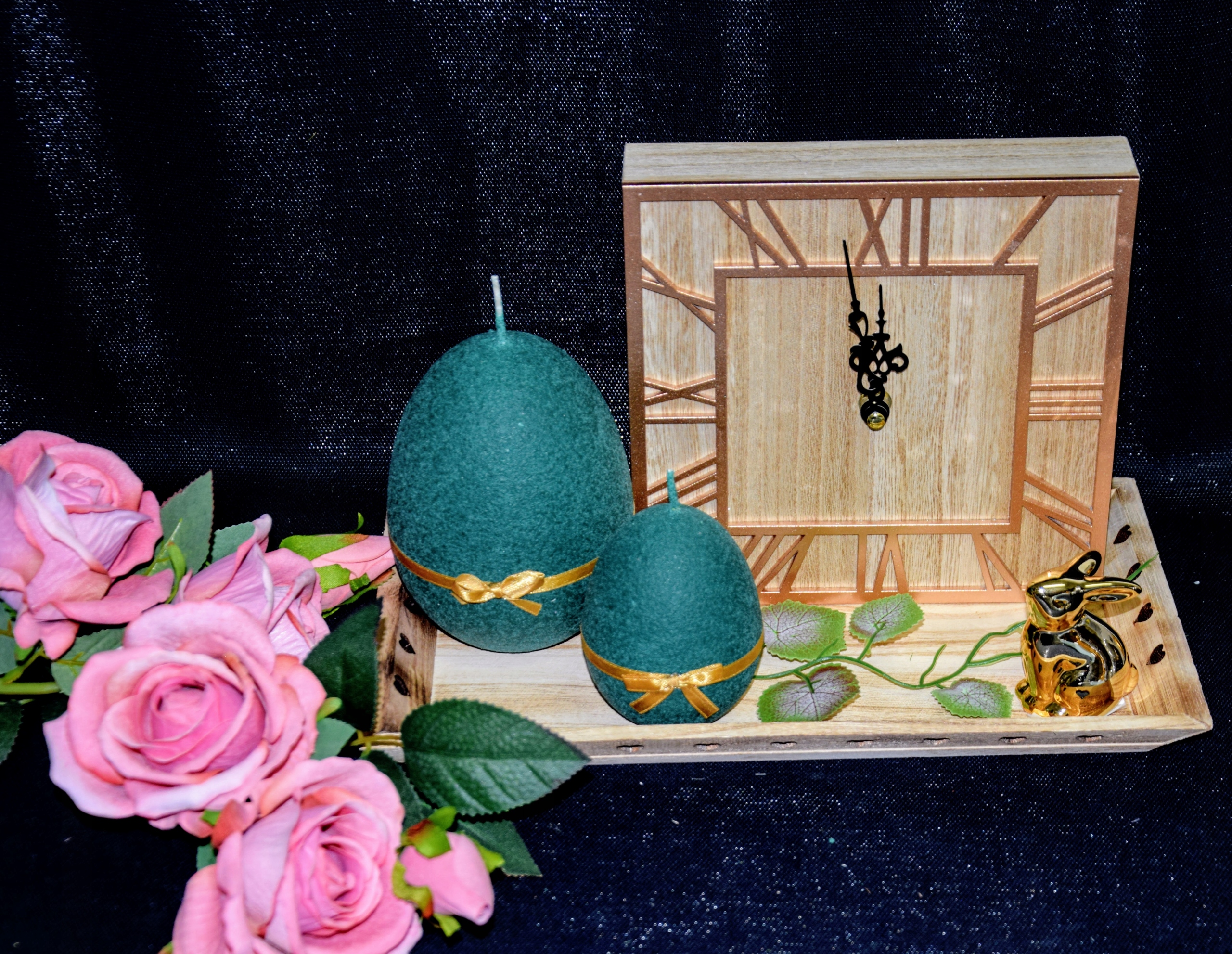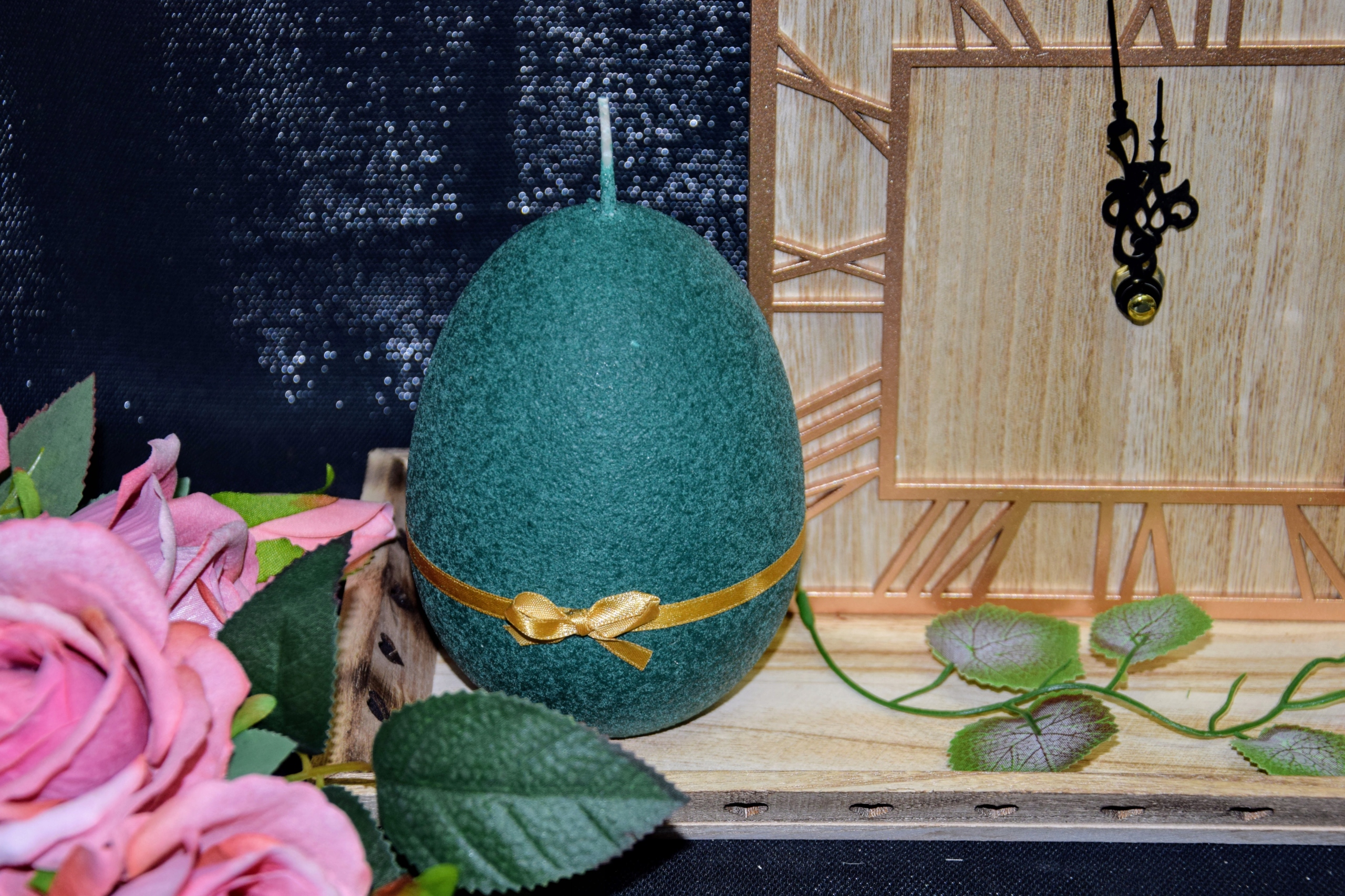 Декоративная свеча яйцевидной формы, темно-зеленый велюр с золотой лентой.