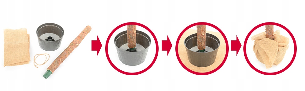 Каждая елочка в наборе имеет устойчивую основу, заполненную цементом и декорированную джутовой тканью. Елка упакована в прочную пятислойную картонную коробку с двойным дном.