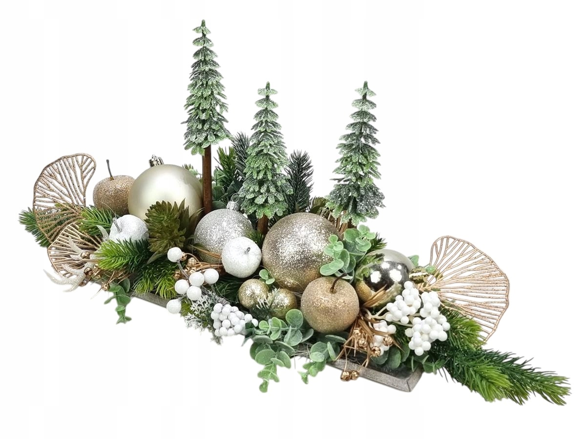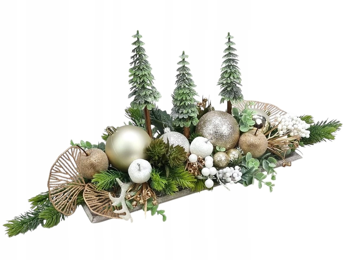 Красивое новогоднее украшение с елками, игрушками и множеством интересных золотых аксессуаров. Еловые веточки выглядят очень естественно, на ощупь даже кажутся живыми.