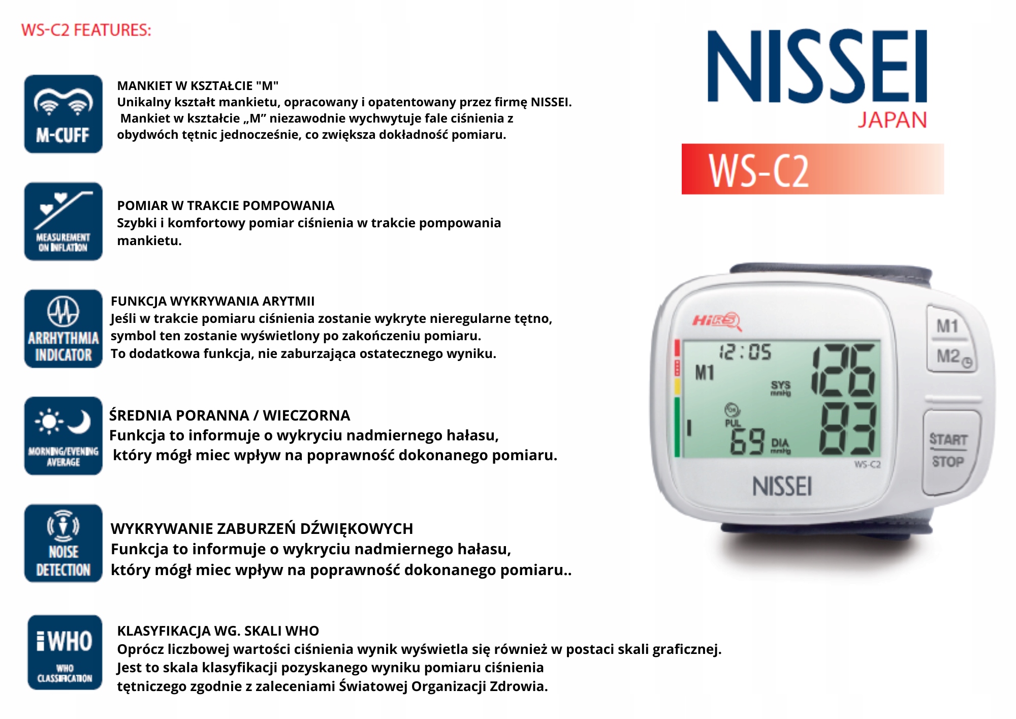Наручный тонометр Nissei WS-C2 обеспечивает простой и удобный способ измерения артериального давления. Предназначен для измерения систолического и диастолического артериального давления и пульса у пациентов старше 15 лет.