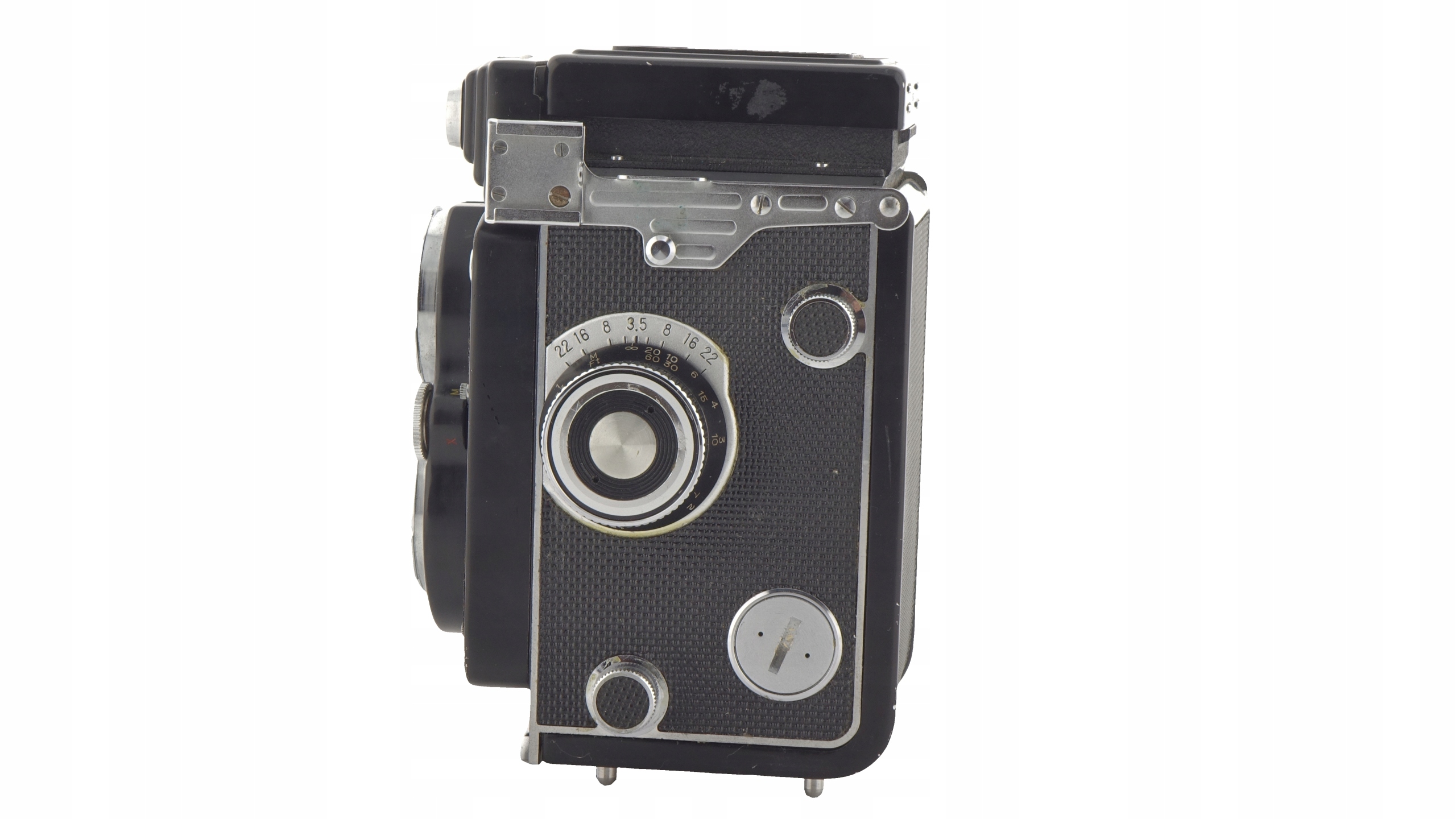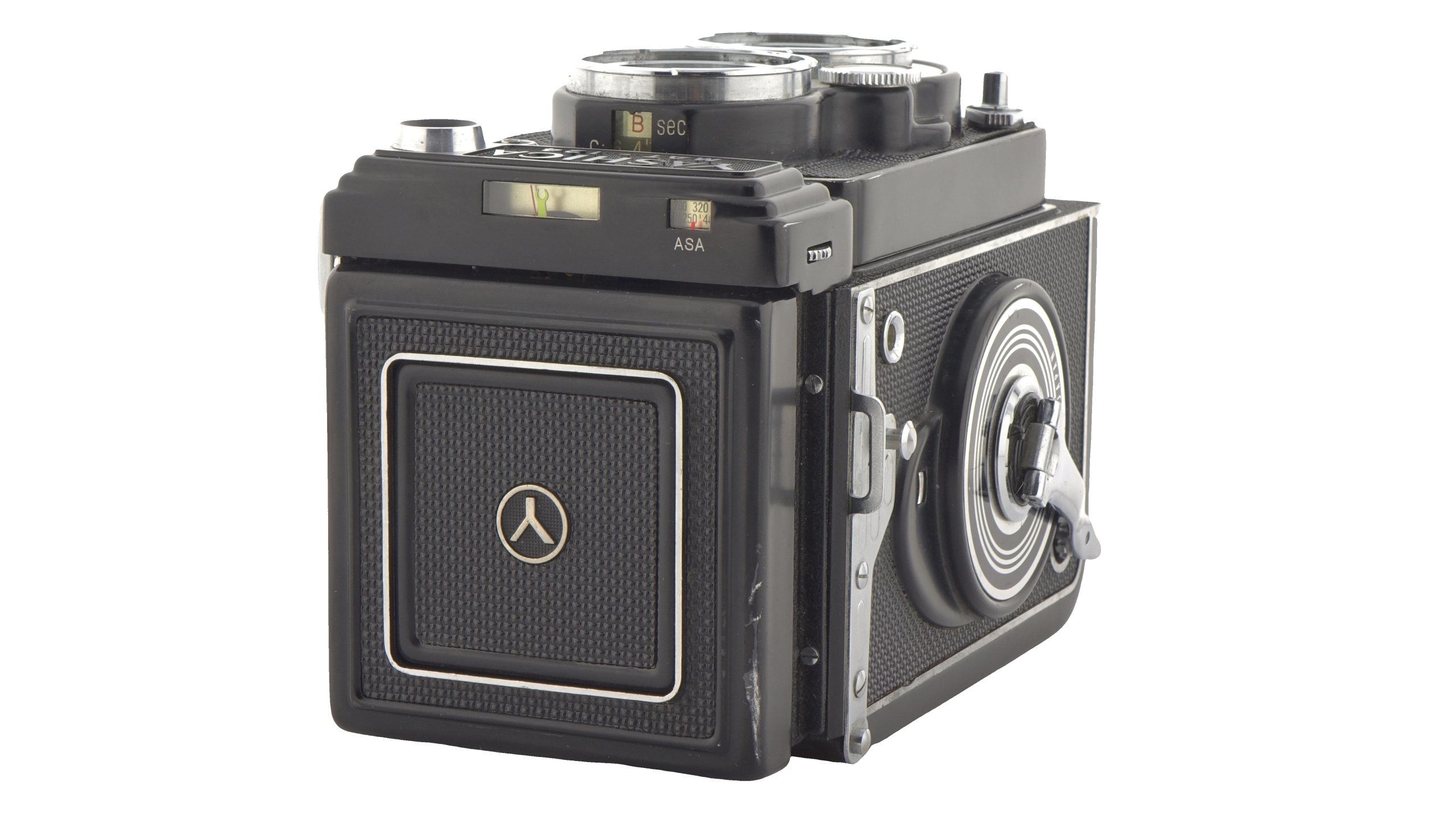 ____________________________________________________________ с 3 -кратным диоптерным увеличением для критической фокусировки, а также для спортивных поисков. Мужчина используется с камерой на уровне талии. SportsFinder, встроенный в Focus Cover, работает после перемещения передней обложки назад. Согласно руководству пользователя, это полезно при фотографировании или при быстром фотографировании объектов на высоте глаз. Copalmigawka SV имеет время от 1 до 1/500 с, плюс B. Он имеет синхронизацию самостоятельного и вспышки с электронными модами X и Bulb M. Они также оснащены связанным счетчиком воздействия с соответствующей иглой, хотя в нем используются выброшенные в настоящее время 1,3 В Vercury Clem. Адекватные заменители и адаптеры для современного щелочного или оксида серебра могут быть приобретены в фото-магазинах и в Интернете. Они могут поддерживать как 120, так и 220 фольги. В центре фокусировки есть ручка, напоминающая тип эмульсии пленки, с настройками дня, негативным, обратным вольфрамовым, черно -белым и пустым.
