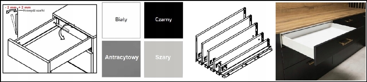 Комплект состоит из белых металлических боков и набора направляющих полного выдвижения. Нижняя и задняя стенки ящика должны быть изготовлены самостоятельно. Преимущество состоит в том, что размеры дна и задней части, а также отверстий спереди и сбоку мебели идентичны размерам ящиков Blum Tandem Box или GTV Axis Pro.