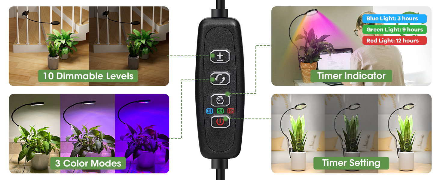 - Функция цикла Таймера: Эта светодиодная лампа для полных растений спектра предлагает функцию таймера памяти цикла с возможностью выбора 3/9/12 часов. Кроме того, могут быть установлены 3 режима освещения и 10 уровней затемнения. Выберите интенсивность света в зависимости от потребностей растений.
