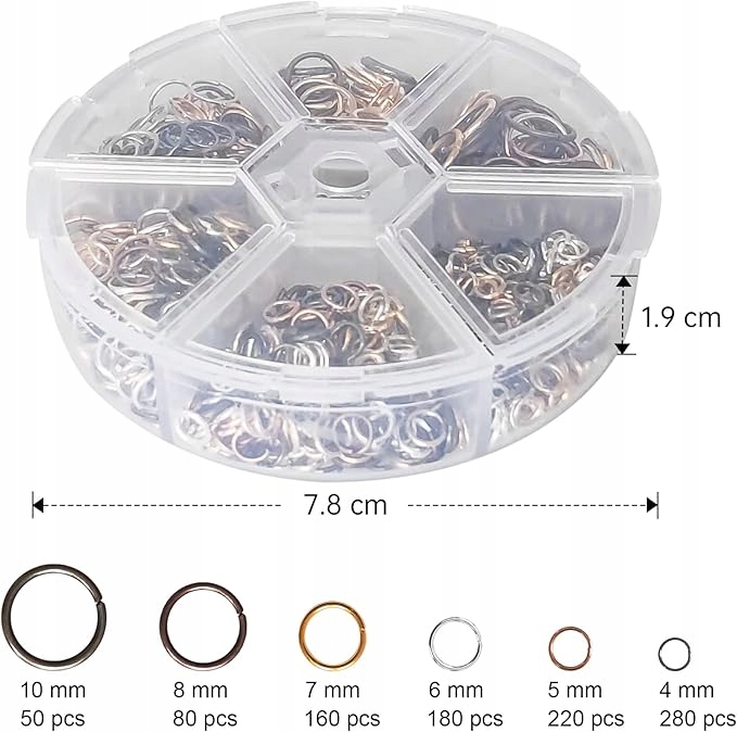 6 размеров прыжковых колец: в одной коробке содержится в общей сложности 970 открытых прыжковых колец 6 размеров. 6 размеров: 4 мм/280 шт., 5 мм/220 шт., 6 мм/180 шт., 7 мм/160 шт., 8 шт., 8 шт., 1 шт., 1 шт. 0 мм/50 мм/50 шт.