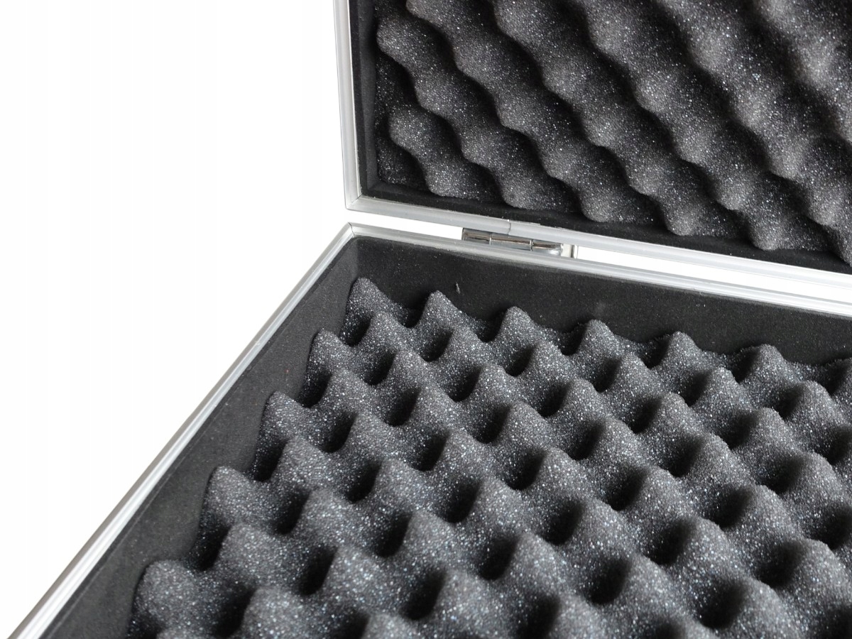 Алюминиевый чемодан для инструментов с наполнением из пенополиуретана. Размеры примерно 22x33x9 см. Благодаря использованию гофрированного пенопласта даже небольшие предметы остаются неподвижными, а паяльник хорошо защищен.