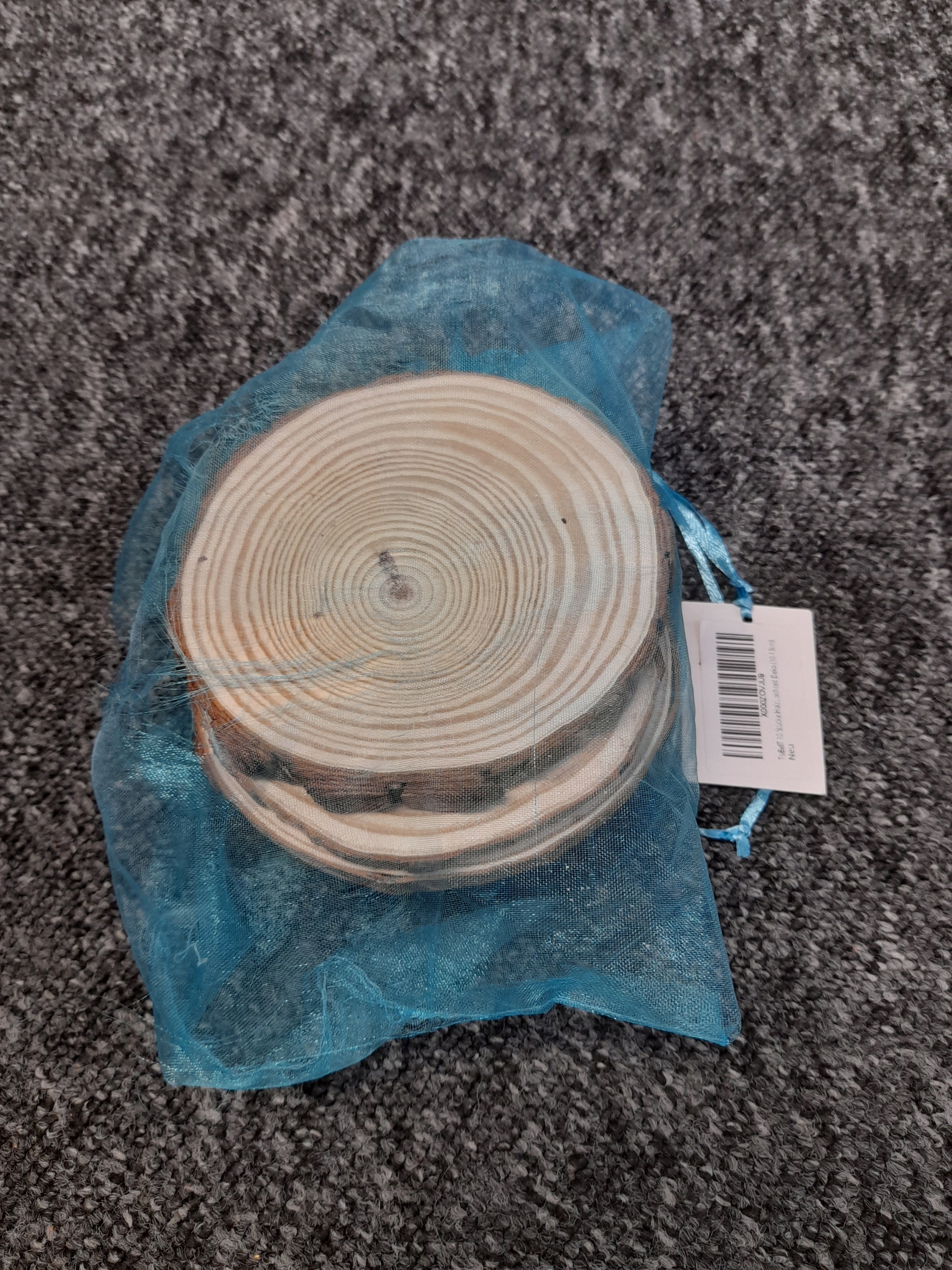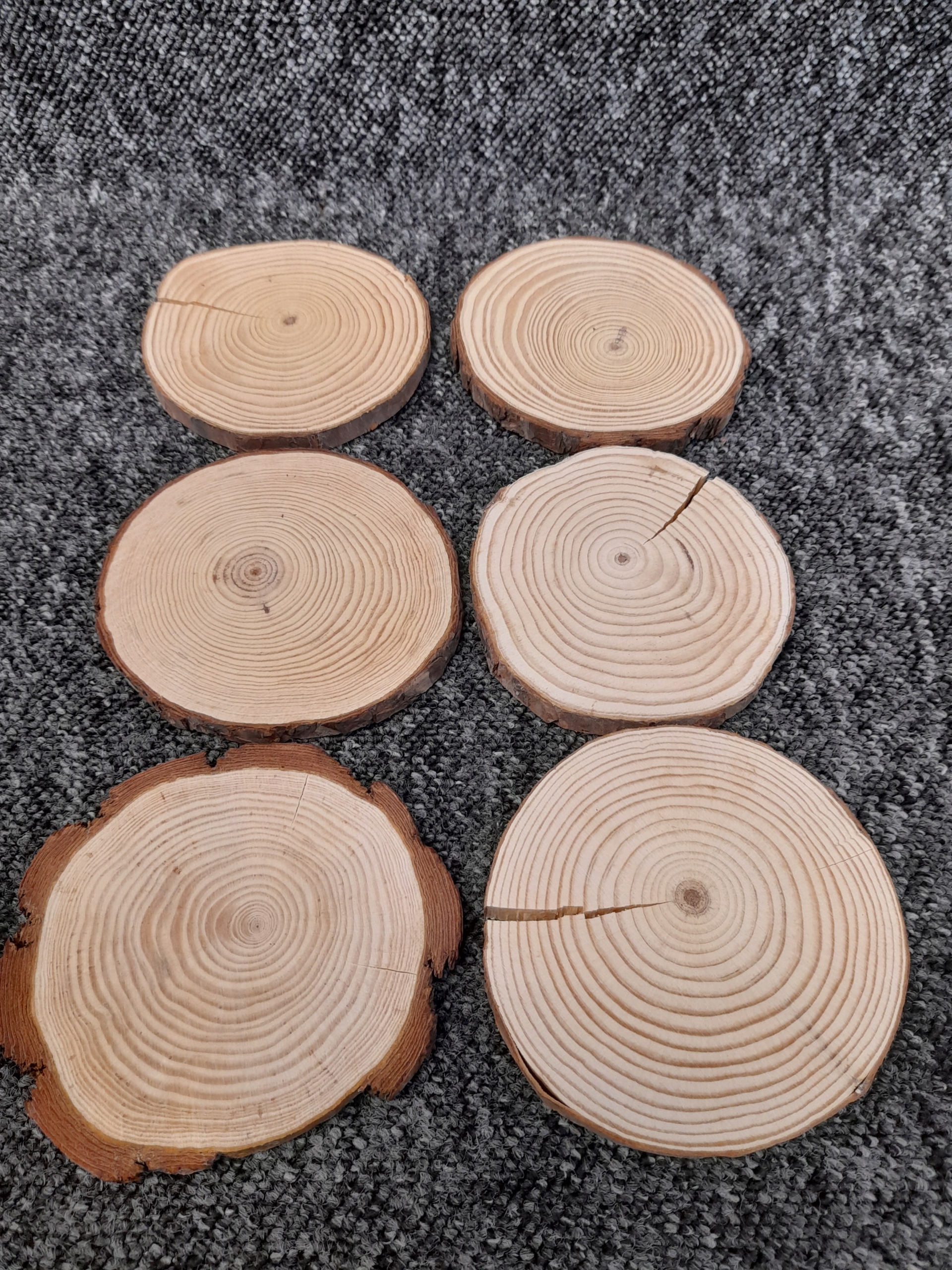 6 шт. деревянных дисков, диаметр около 10-12 см, толщина около 1 см. Это диск из натурального, необработанного дерева, поэтому могут быть небольшие отклонения в размерах и внешнем виде.