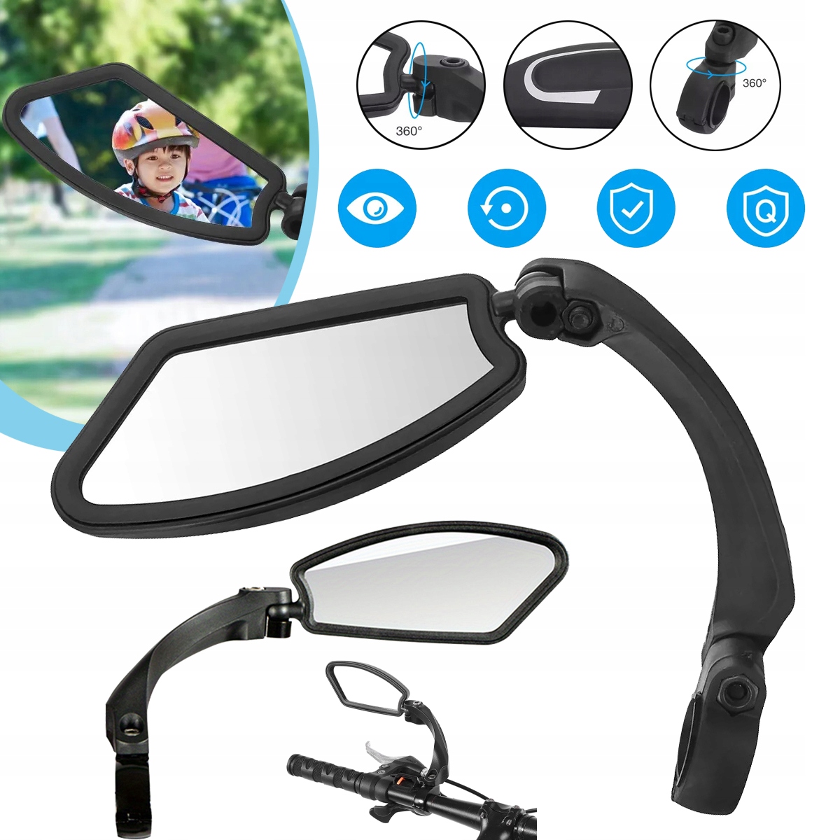 🚴 Высококачественное зеркала заднего вида велосипедов: Зеркало велосипедного рулевого колеса с прочной рамой, воздействие, прочное, устойчивое к падающему прозрачному зеркалу, в соответствии с размером, более эффективной оценкой истинного расстояния, SAFER. Большое поле зрения: Зеркало велосипеда имеет слегка выпуклую поверхность, которая производится в процессе нажатия и обеспечивает более широкое поле зрения, чем обычное зеркало заднего вида. Это может значительно повысить безопасность при езде на велосипеде по городским дорогам.