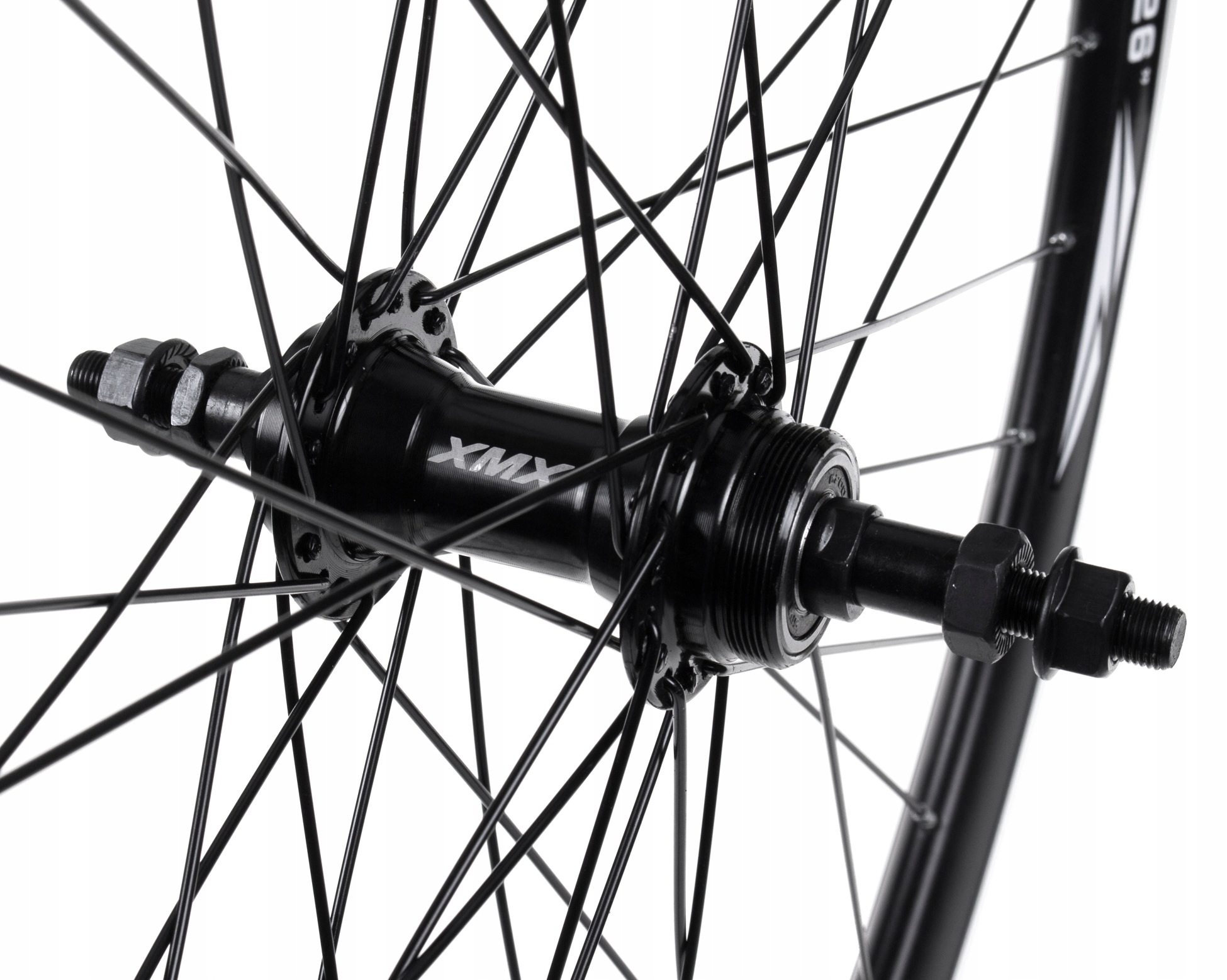Заднее колесо велосипеда размером 26 дюймов из алюминия трехкамерный обод XMX, JY-362 концентратор и 36 спиц. Конический ободок дополнительно усилен двойным профилем, имеет высоту 30 мм и внутреннюю ширину 18 мм. Кроме того, он имеет специально отфрезерованные боковины и индикатор уровня износа тормозных накладок. Он посвящен велосипедам MTB, ATB и CITY. Ступица с серебряным уплотнением. Все колесо скреплено стальными спицами UCP. Благодаря использованию высококачественных комплектующих колесо велосипеда чрезвычайно прочное, прочное и жесткое. Он обеспечивает безопасное, комфортное вождение и плавную работу всего шасси.