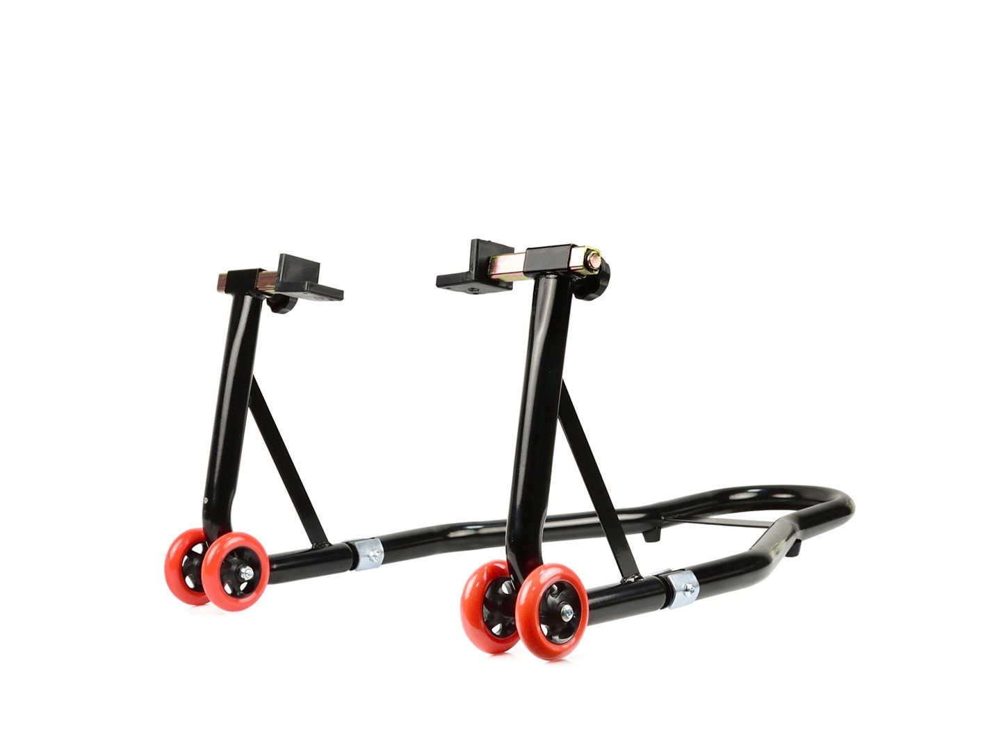 Усиленная мотоциклетная стойка для задней оси. Для производства была использована стальная труба с порошковым покрытием диаметром 32 мм. Кроме того, усиленная конструкция подставки гарантирует стабильный и безопасный подъем мотоцикла. Колеса изготовлены из высококачественного АБС-пластика.