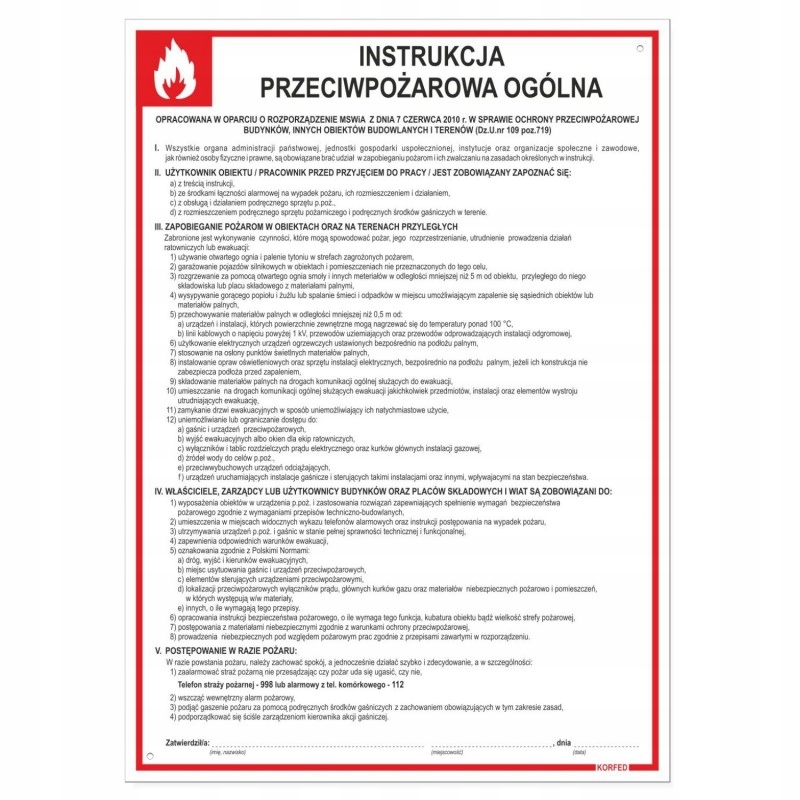 Подготовлена на основании ПОСТАНОВЛЕНИЯ МИНИСТРА ВНУТРЕННИХ ДЕЛ И АДМИНИСТРАЦИИ от 7 июня 2010 года о противопожарной защите зданий, другие строительные объекты и площади (Законодательный вестник № 109, поз. 719)