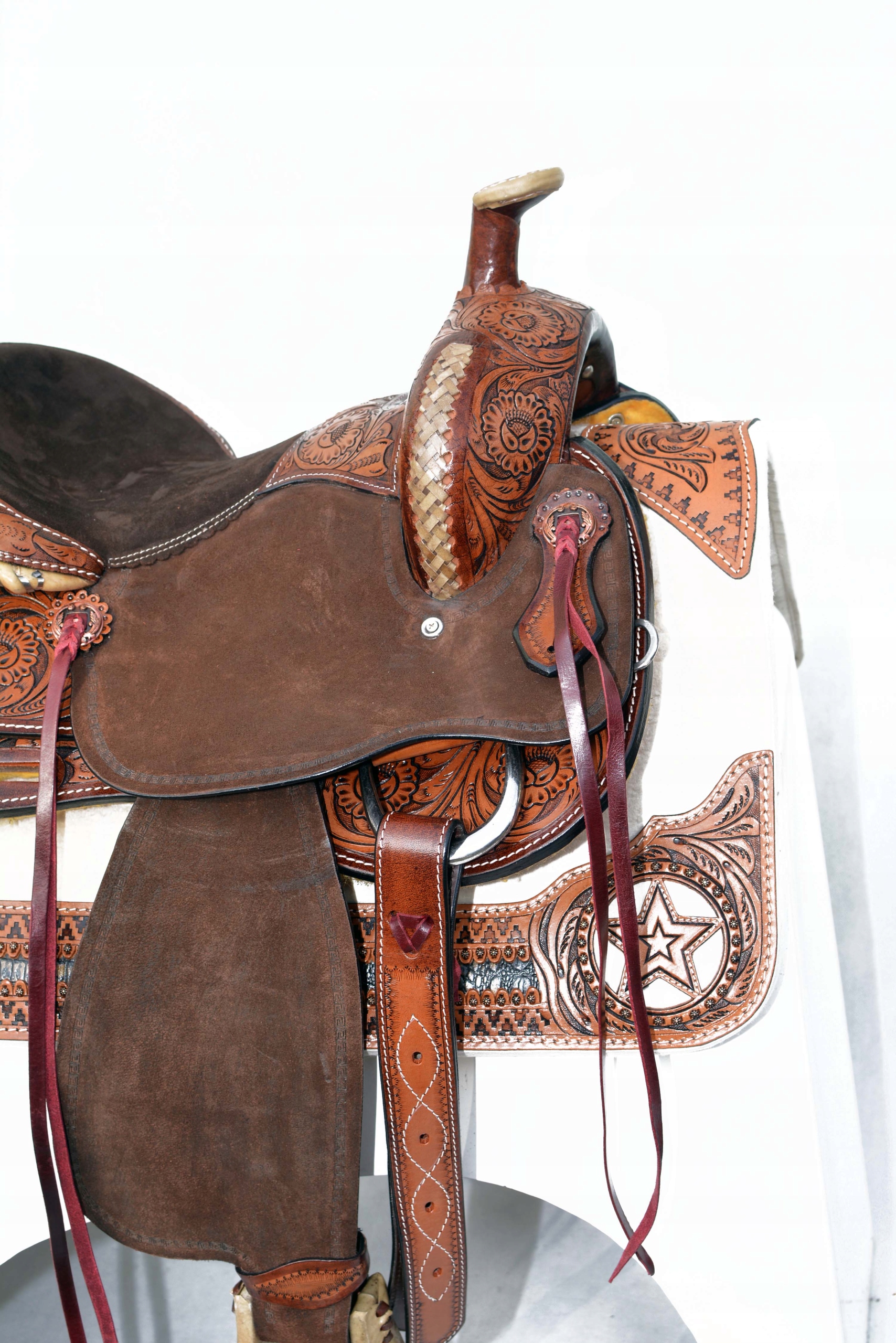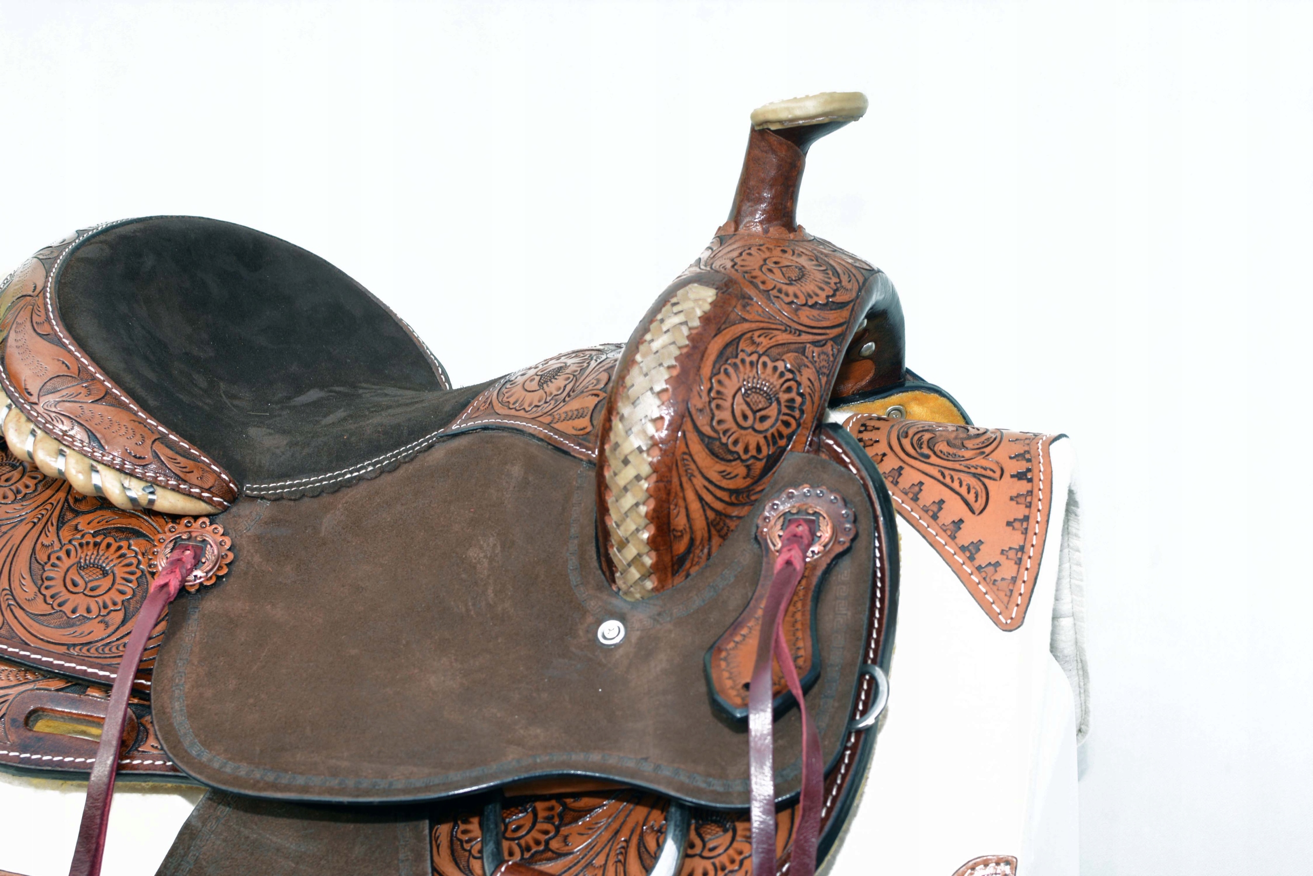 Седло Western из США, 16 дюймов. Седло изготовлено в шорно-седельной мастерской из очень хороших сортов отборной зерновой коровьей кожи, на подкладке из толстого плюшевого мишки, вся резьба выполнена вручную. Единственное такое седло на рынке по такой низкой цене. Седло можно приобрести вместе с шорной тканью, удилом, уздечкой и поводьями. Смело покупайте.