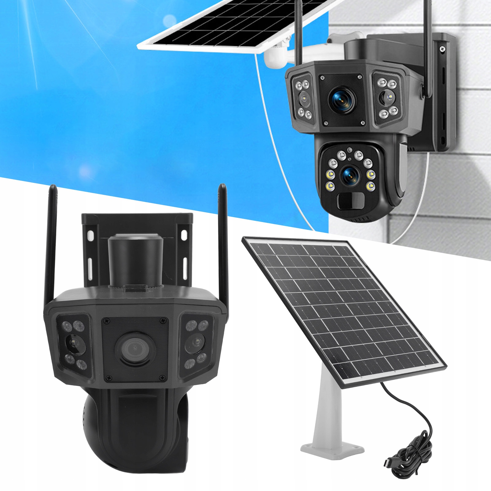 4. Солнечная панель и большая батарея. Он оснащен высокоэффективной солнечной панелью мощностью 8 Вт и аккумулятором LI емкостью 8000 мАч с низким содержанием щелочи, что устраняет необходимость в проводке или частой зарядке, обеспечивая непрерывное использование на открытом воздухе и предлагая надежное решение, не требующее особого обслуживания