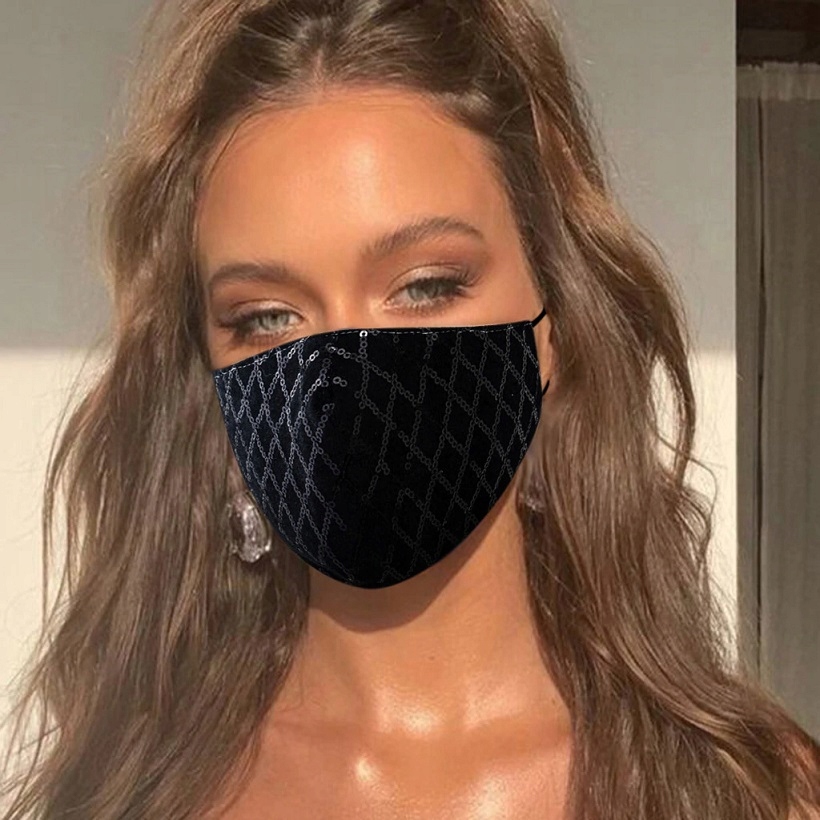 Внешний слой украшен узором из мелких блесток, которые сверкают на свету. Эти пайетки размещены на полиэфирной сетчатой ткани, а внутренний слой - хлопок. Материалы можно стирать, их можно стирать при температуре 40°C. Маску также можно быстро простерилизовать, залив ее небольшим количеством кипятка. Это делает маску многоразовой.