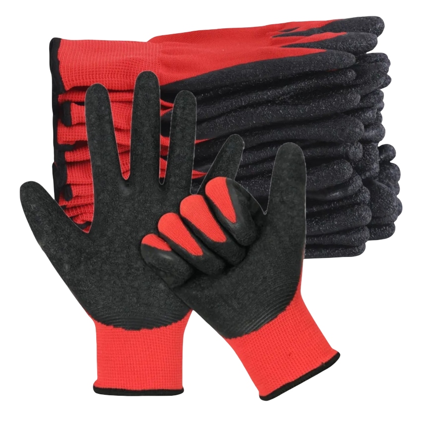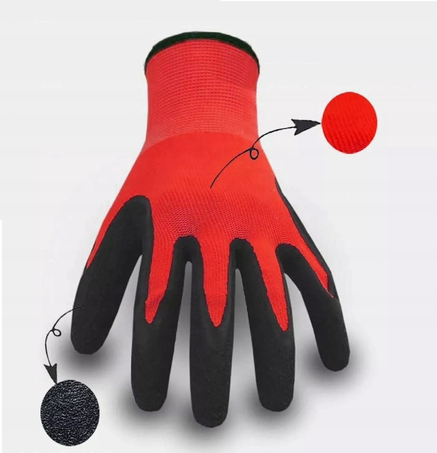 ✅ Перчатки защитные, из красного полиэфирного трикотажа, с покрытием из черного латекса, бесшовные, отделанные манжетой.