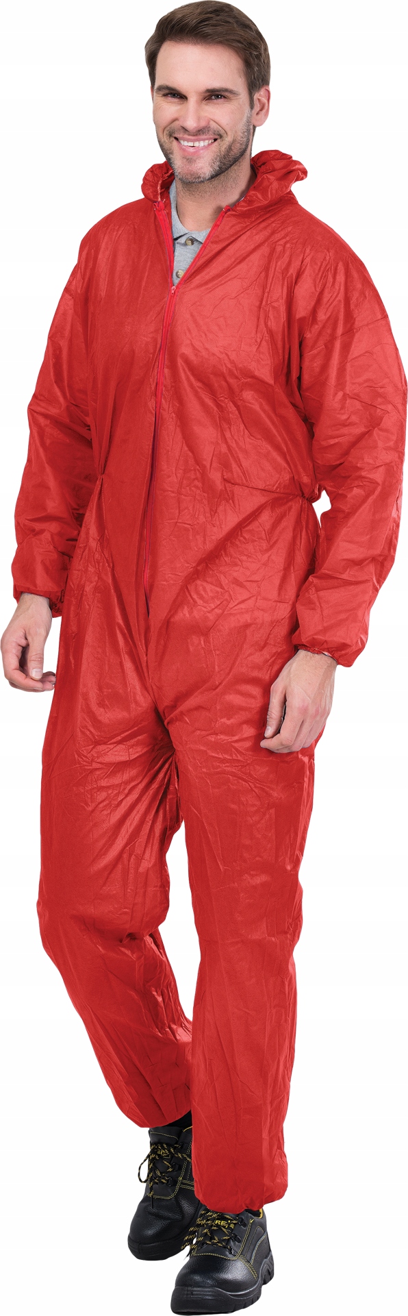 Комбинезон защитный красный, капюшон, молния, размер М.