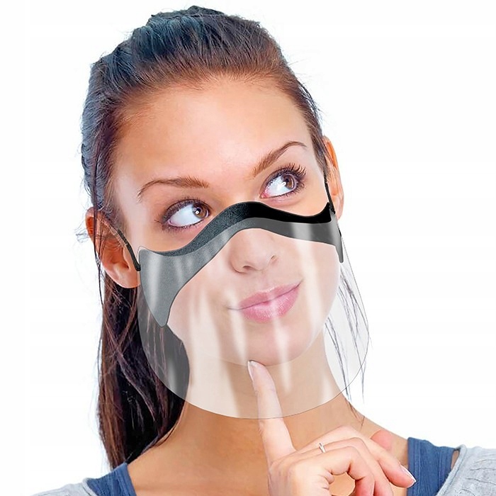 Легкий и удобный защитный козырек для рта и носа (кроме глаз). Она сочетает в себе комфорт маски и, благодаря своей прозрачности, действует как щиток для лица. Изделие многоразового использования, изготовлено из полиэфирного стекла плотностью 200-300 г и прочного пенопласта в качестве структурного элемента. Крепится за ушами на черных резинках.