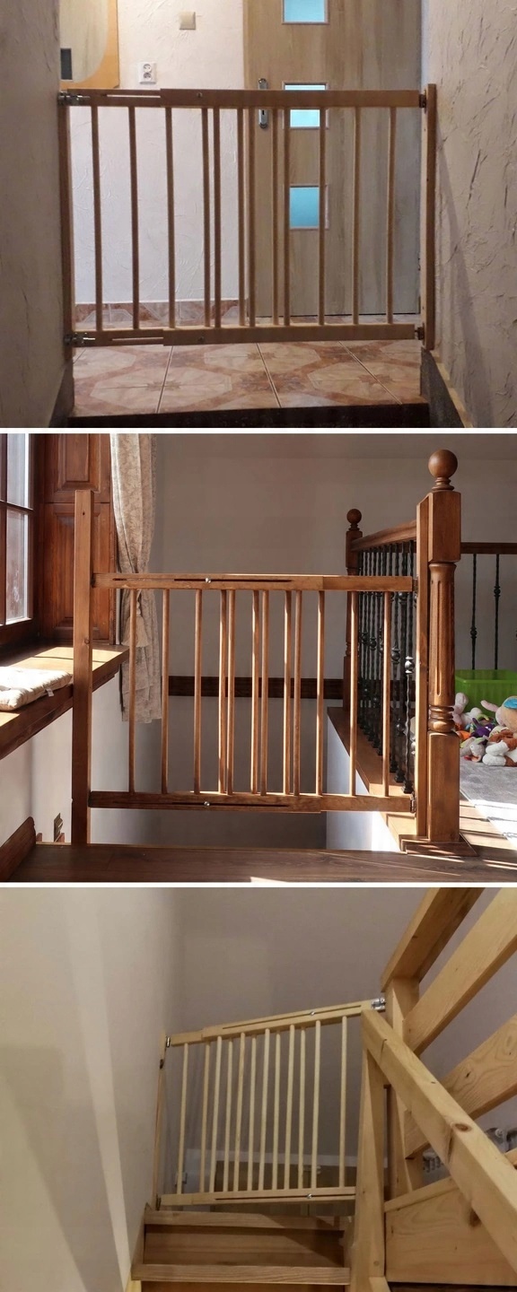 Ворота безопасности с крепежными элементами ( входит в комплект) весит примерно 5,5 кг. Его вес является преимуществом, поскольку доказывает высокое качество изделия, особенно из дерева.