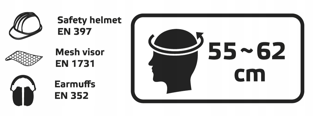 Защита слуха, головы и зрения 3 в 1, шлем из качественного АБС-пластика, диапазон регулировки размера 55-62 см; соответствует стандарту EN397; наушники с мягкой внутренней отделкой, отношение сигнал/шум 25,7 дБ; изготовлен в соответствии со стандартом EN 352; защитная маска для лица из металлической сетки, защищающая от мелких твердых частиц, соответствующая стандарту EN 1731; CE