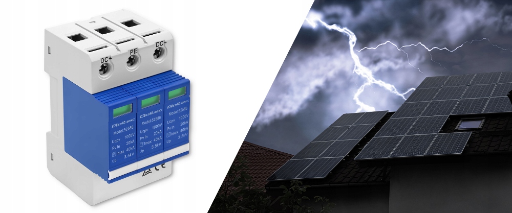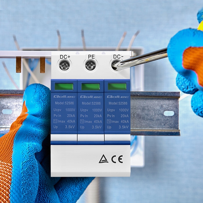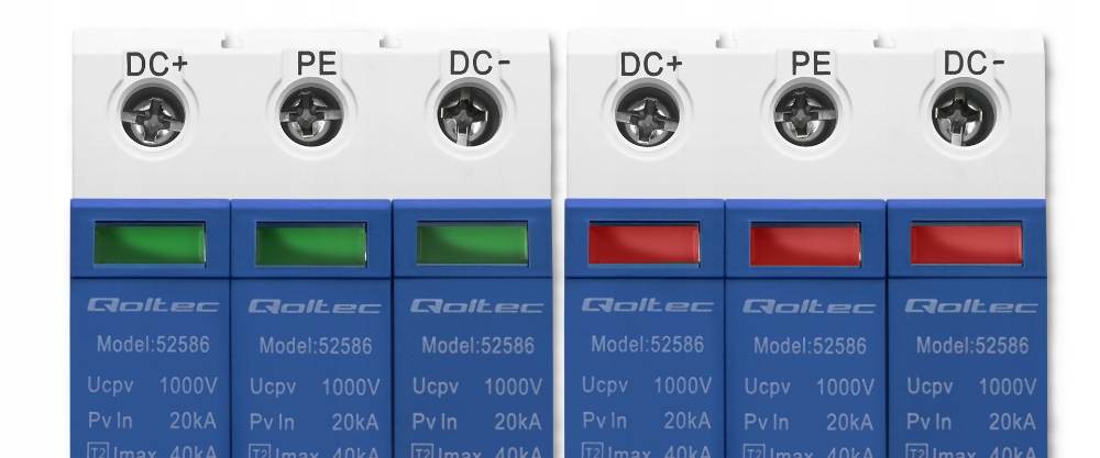 Ограничители перенапряжения марки Qoltec оснащены датчиками высокого напряжения и трехступенчатым переключателем постоянного тока. Защита состоит из базовой части и вставных защитных модулей. Он подходит для использования в фотоэлектрических устройствах. Кроме того, продукт характеризуется: