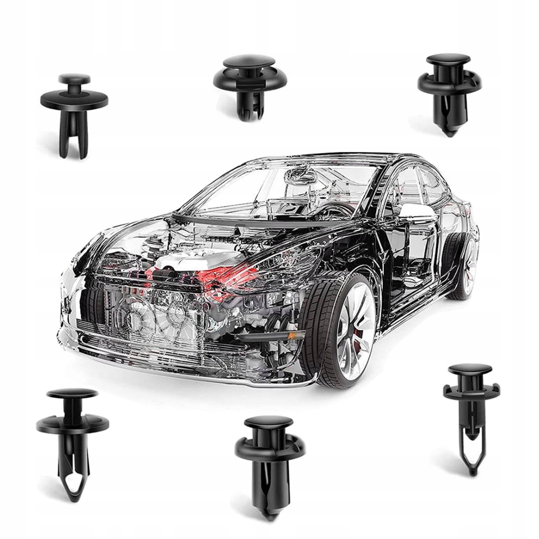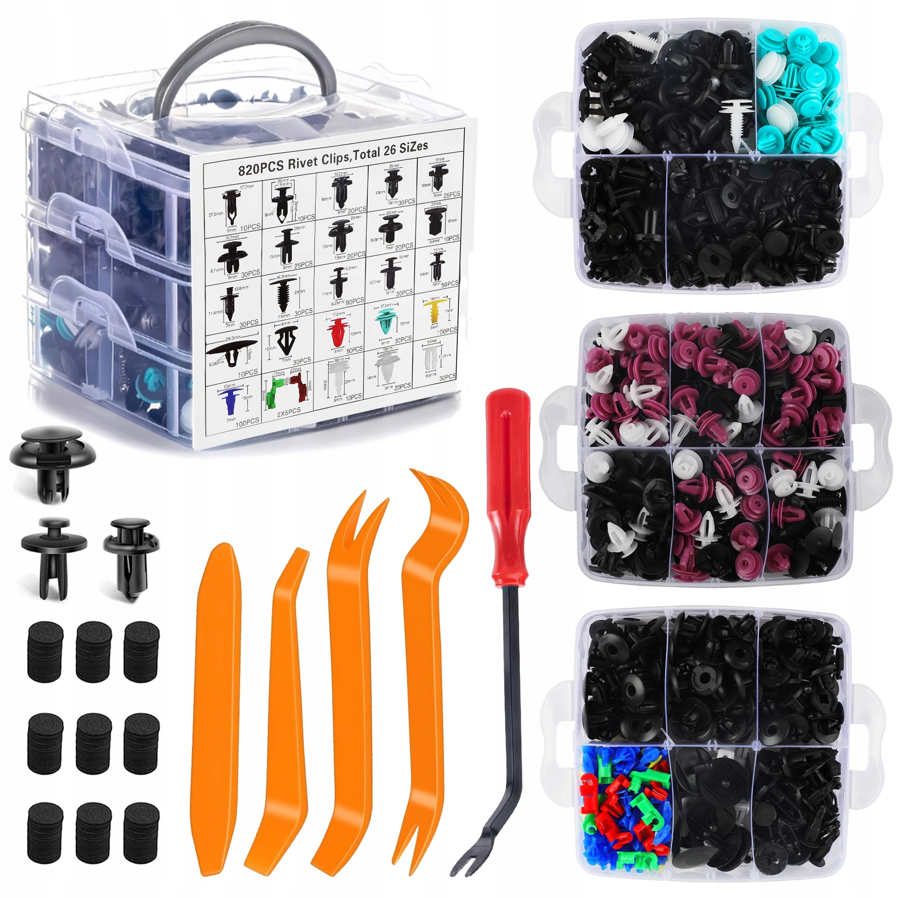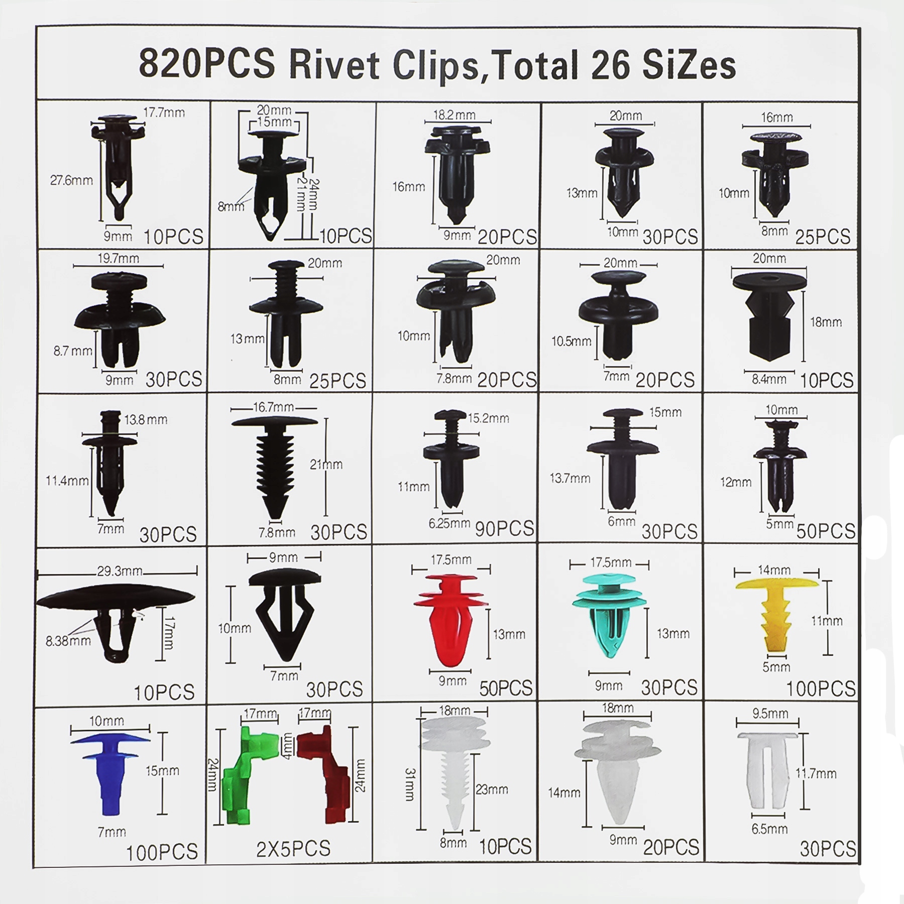 В упаковке вы можете найти различные пластиковые наборы для закрепления заклепков, достаточных для удовлетворения ваших потребностей. Их легко установить, просто удалите исходный зажим и нажмите на новый штифт. Вам не нужно ходить в магазин автомобильных запчастей, чтобы искать различные крепежные элементы. Экономия времени и денег.
