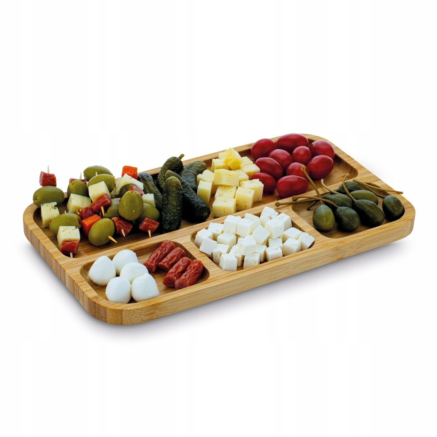 Бамбуковая тарелка для закусок Tadar размером 33 х 19,5 х 1,6 см эстетична, долговечна и безопасна для пищевых продуктов. Деревянная структура тарелки позволяет дополнить посуду экологическим продуктом. С ее помощью вы обеспечите правильную подачу закусок на столе. Вы также разделите содержимое тарелки и предотвратите его смешивание. Вы можете использовать его, например, во время домашней вечеринки. Вы найдете ему применение при просмотре фильмов с близкими. Поверхность пластины разделена на 4 части и имеет прямоугольную форму.