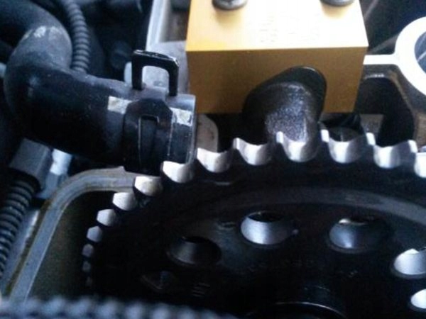 1) Установите первый замок на первый цилиндр выпускного вала (слева со стороны газораспределительного механизма) - верхом к шестерне (как показано ниже).