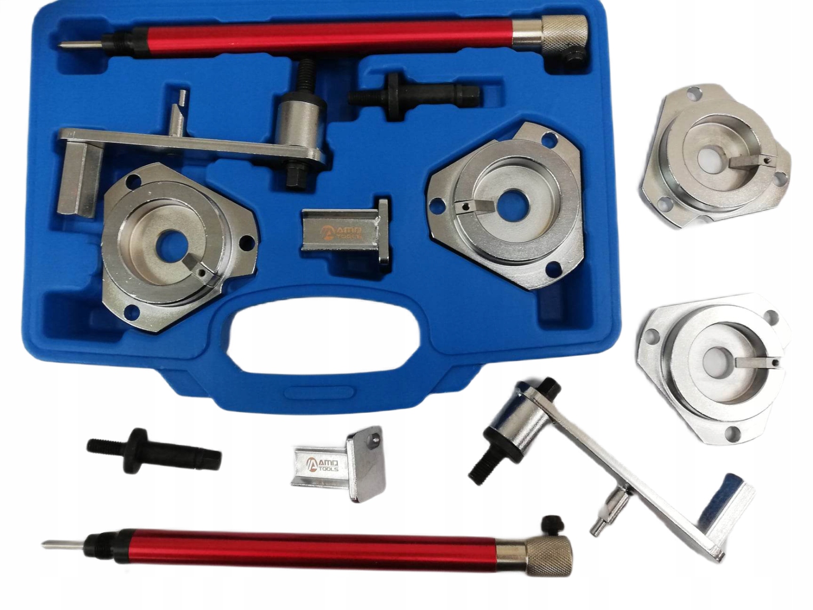 Профессиональный комплект фиксаторов ГРМ от AMD Tools, предназначенный для бензиновых двигателей с ременным приводом.