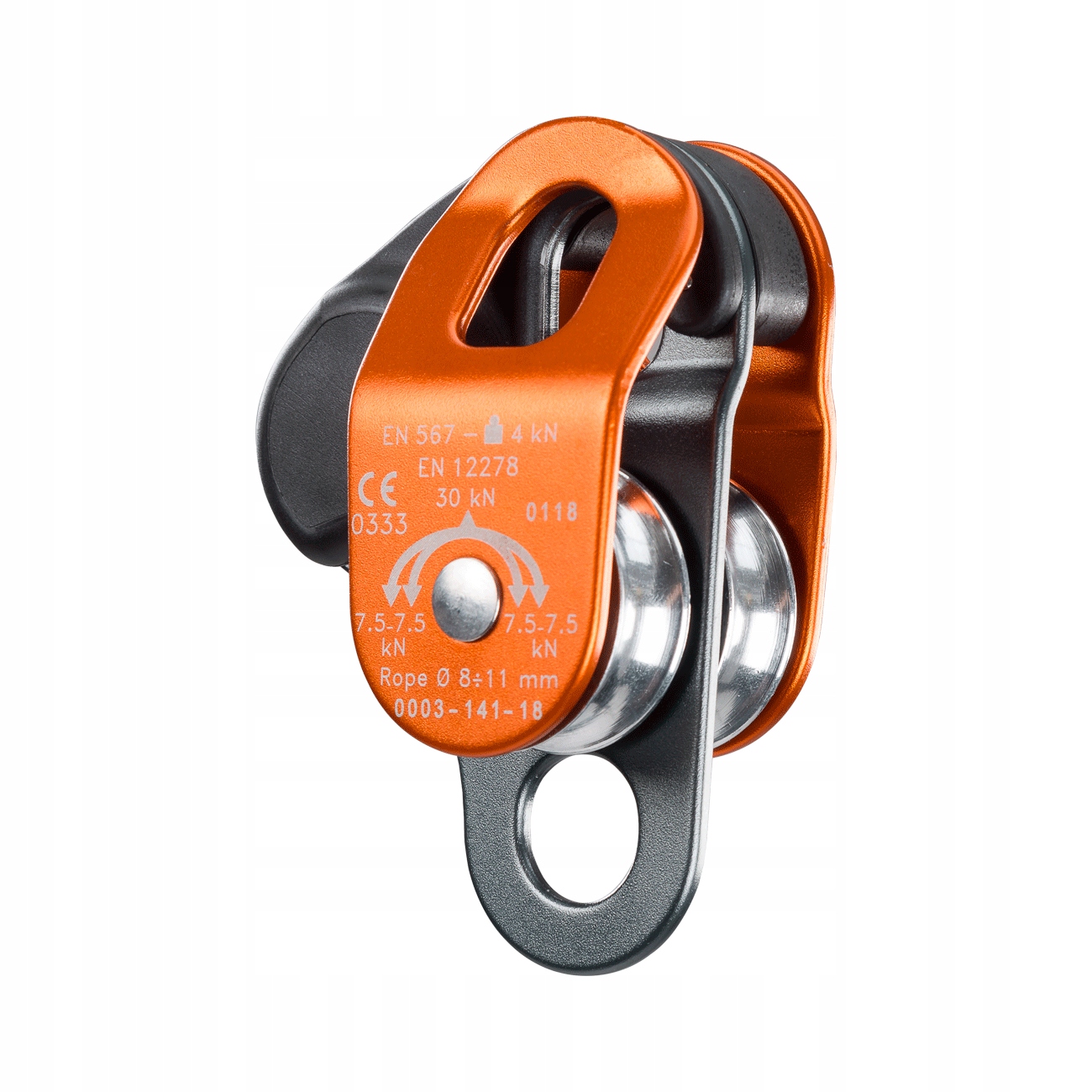 Двойной блок с мобильными крышками может использоваться как при подтягивании веса/оборудования, так и времени спасения для подъема жертвы, а также можно использовать в качестве устройства экстренного зажима после блокировки на линии. Крыш и шариковые подшипники изготовлены из анодированного легкого сплава. Работает с веревками с диаметром 8-11 мм.