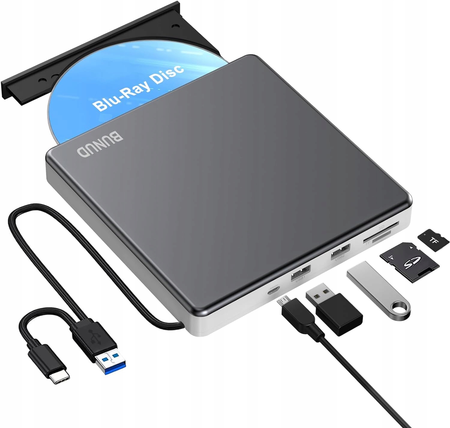 Внешний привод Blu-ray оснащен независимым слотом для карт SD/TF, 2 портами USB и разъемами micro USB. Он может передавать фотографии и видео непосредственно с SD/TF-карты на компьютер, жесткий диск USB и флэш-накопитель. Совет: SD-карта и TF-карта не могут работать вместе одновременно, выберите только одну.